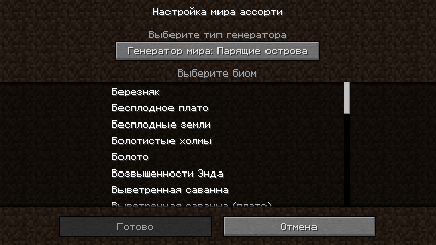 Игрок может указывать любые доступные биомы, в том числе технические. Доступно три варианта генерации: поверхность, парящие острова и пещеры. Например, мир с биомом болота и генерацией парящих островов будет создавать парящие острова с биомом болота, в то время как биом возвышенностей Края будет генерировать города Края на земле. Биомы Края, созданные с генерацией «поверхность», содержат врата Края, которые ведут сами к себе.