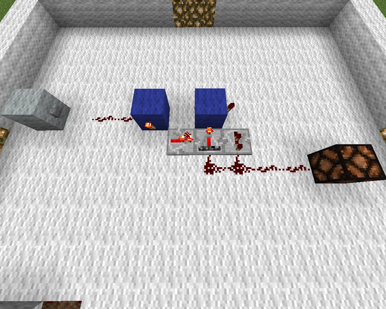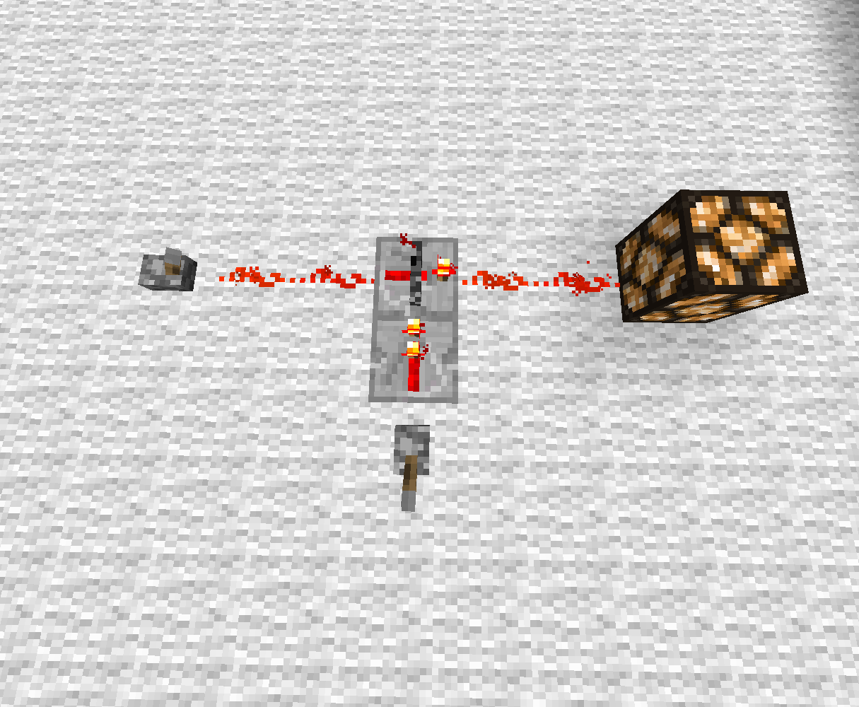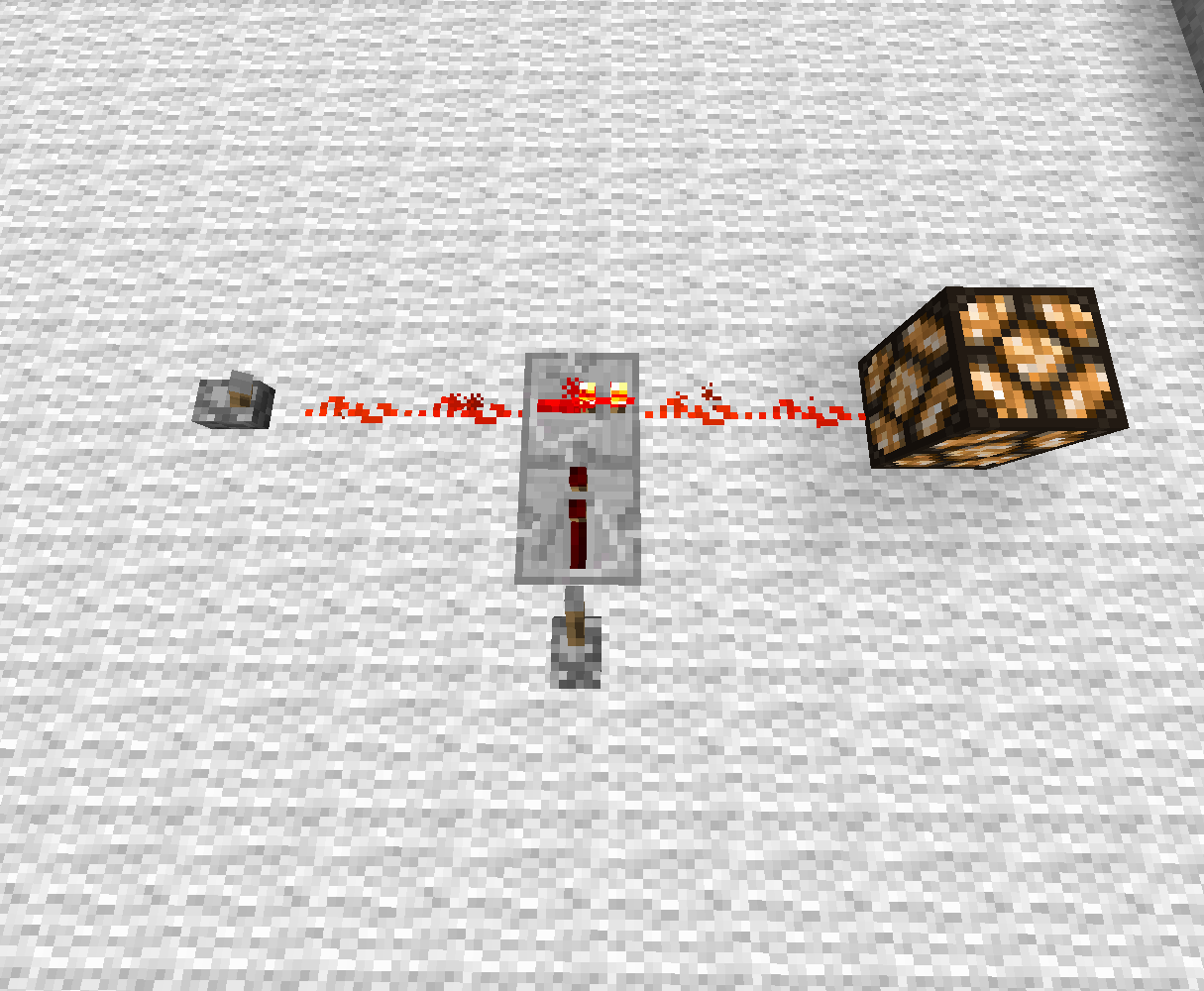 В 12w42a (1.4) появился механизм блокировки повторителей. Заблокированный повторитель удерживает сигнал на выходе в состоянии на момент блокировки, вне зависимости от входа. Как только блокировка снимается, выход снова приходит в соответствие со входом. Для выполнения блокировки нужно подвести к боковой стороне повторителя другой активированный повторитель. У заблокированного повторителя вместо заднего факела появится тонкий прут из коренной породы поперек направления сигнала.