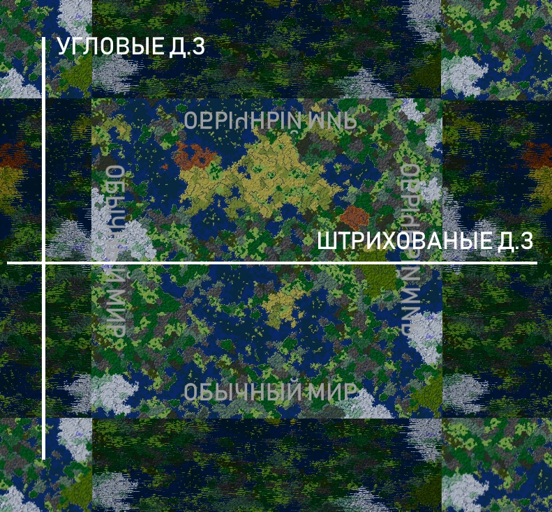 При телепортации на координаты X/Z ± 30.000.000 вы увидите странные текстуры. Это будут блоки коренной породы без нескольких сторон, расположенные в равных промежутках друг от друга. Выше будут квадраты воды, тоже в равных промежутках друг от друга. Перемещение по осям X и Z возможно только с помощью элитр и пиротехнической ракеты.