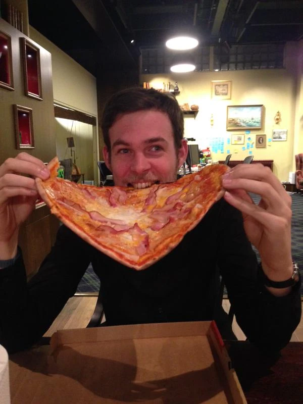 Даниэл показывает Марку Уотсону как правильно есть пиццу[7]