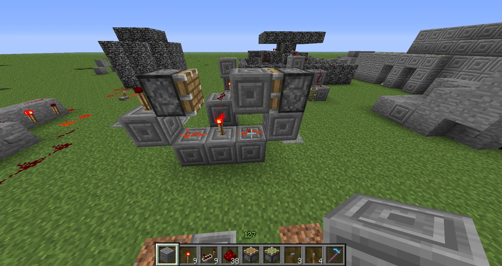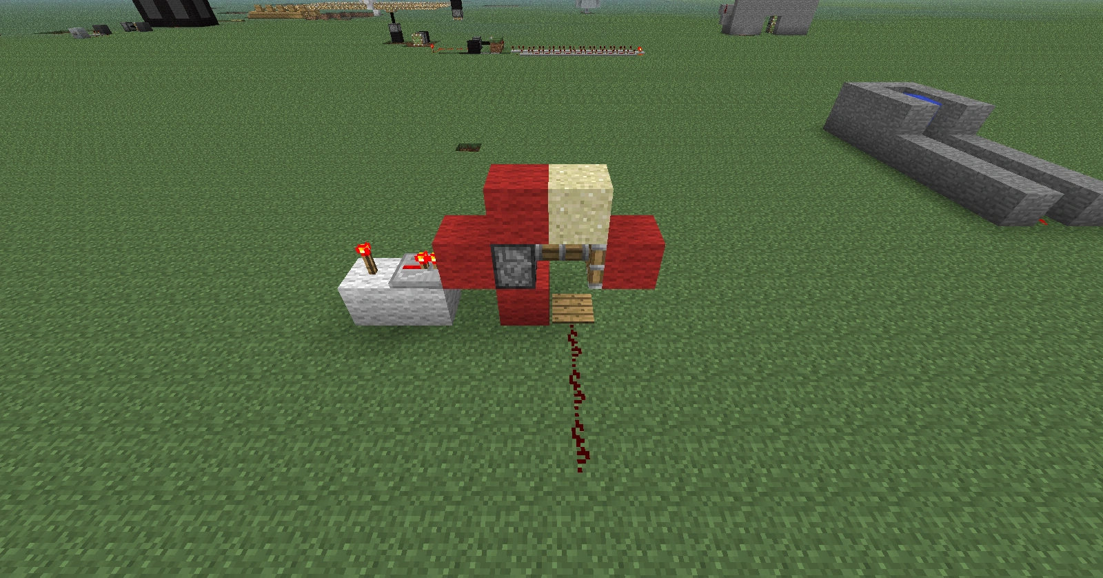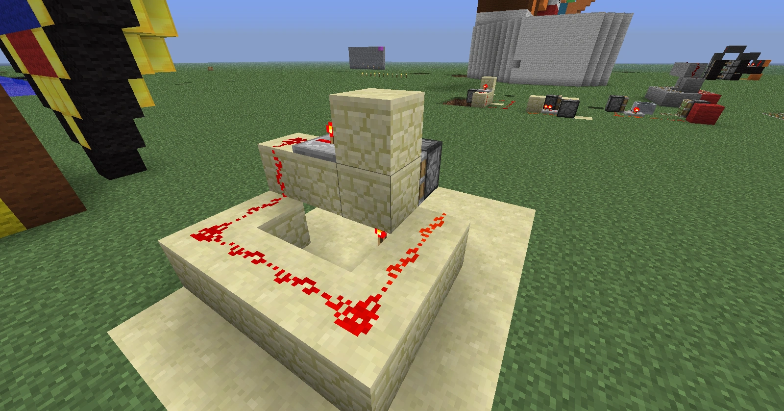 Ошибки кода не позволяют напряжению в блоке красного провода нормально определяться, когда он запитан от нескольких источников. Это может быть использовано для создания большого ДОБ как внизу. 12 нижних левых блоков провода являются сенсорами.