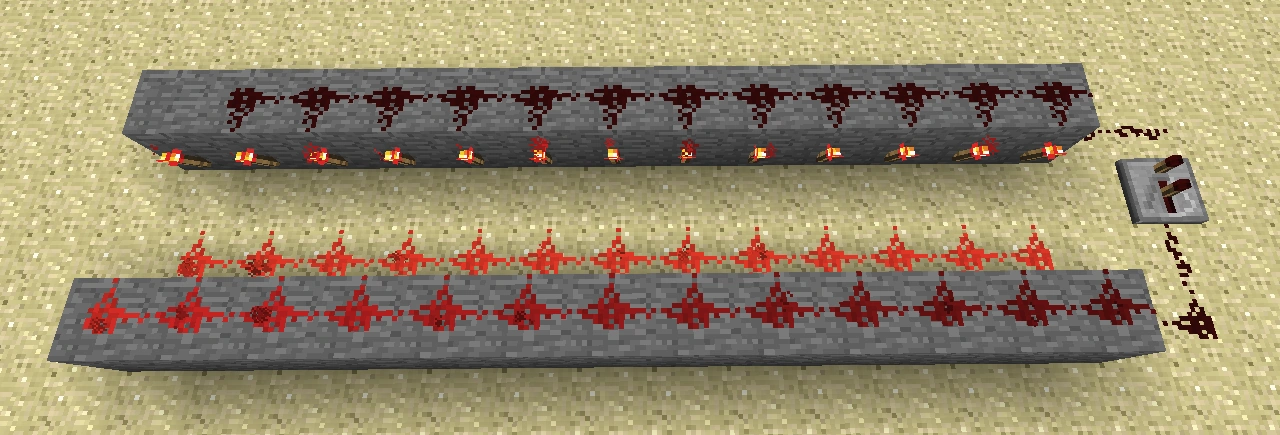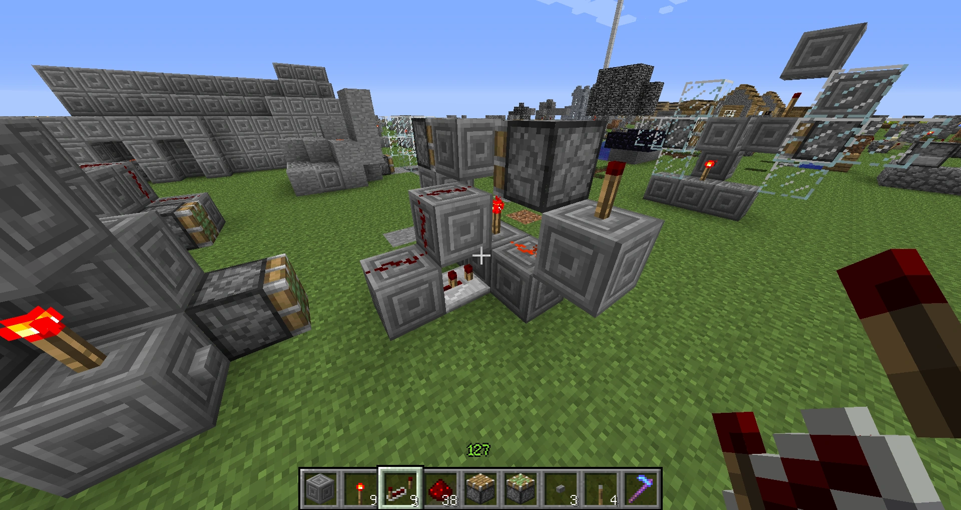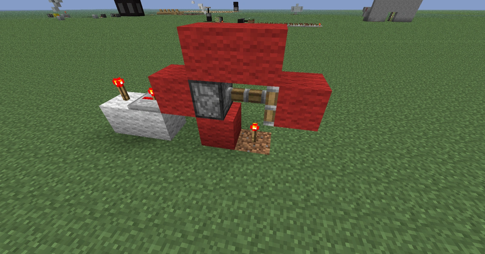 Ошибки кода не позволяют напряжению в блоке красного провода нормально определяться, когда он запитан от нескольких источников. Это может быть использовано для создания большого ДОБ как внизу. 12 нижних левых блоков провода являются сенсорами.