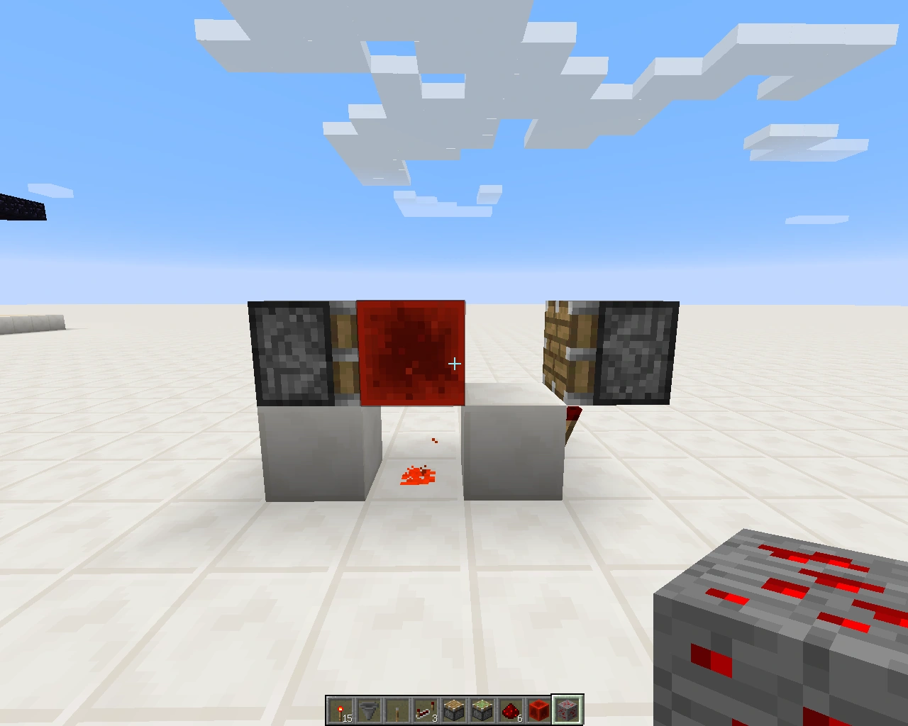 Более экономный вариант (вместо липкого поршня и красного факела используется обычный поршень, песок и нажимная плита. (красной шерстью помечена область определения, с боков тоже считается)