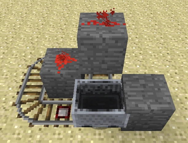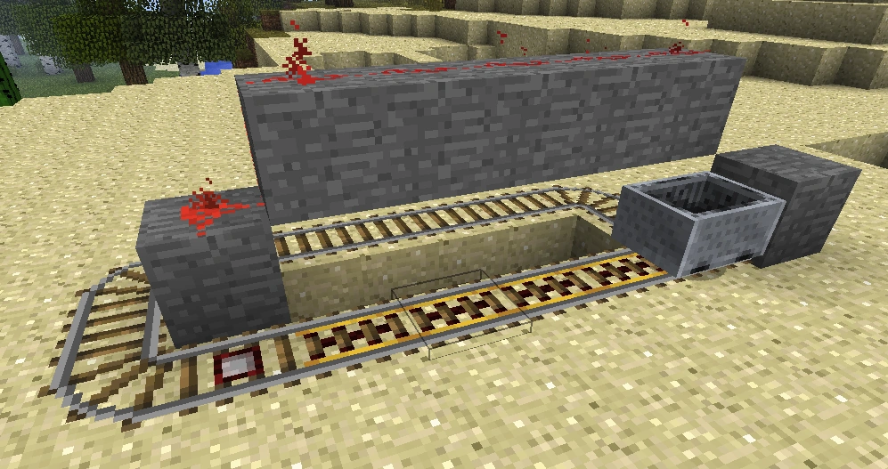 Блок сенсоров из электрических рельс. Заметьте, что сбоку на блок под нажимным рельсом поставлен красный факел. Под вагонеткой также находится электрический рельс.