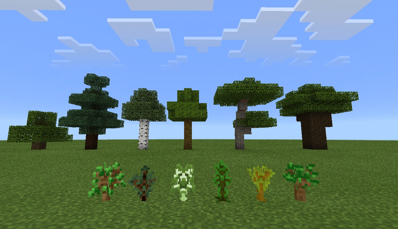 В Halloween Update появились биомы, для которых определены свои цвета листвы и типы строения деревьев. В Beta были также добавлены уникальные их виды: берёзы в умеренных биомах и ели и сосны в холодных.