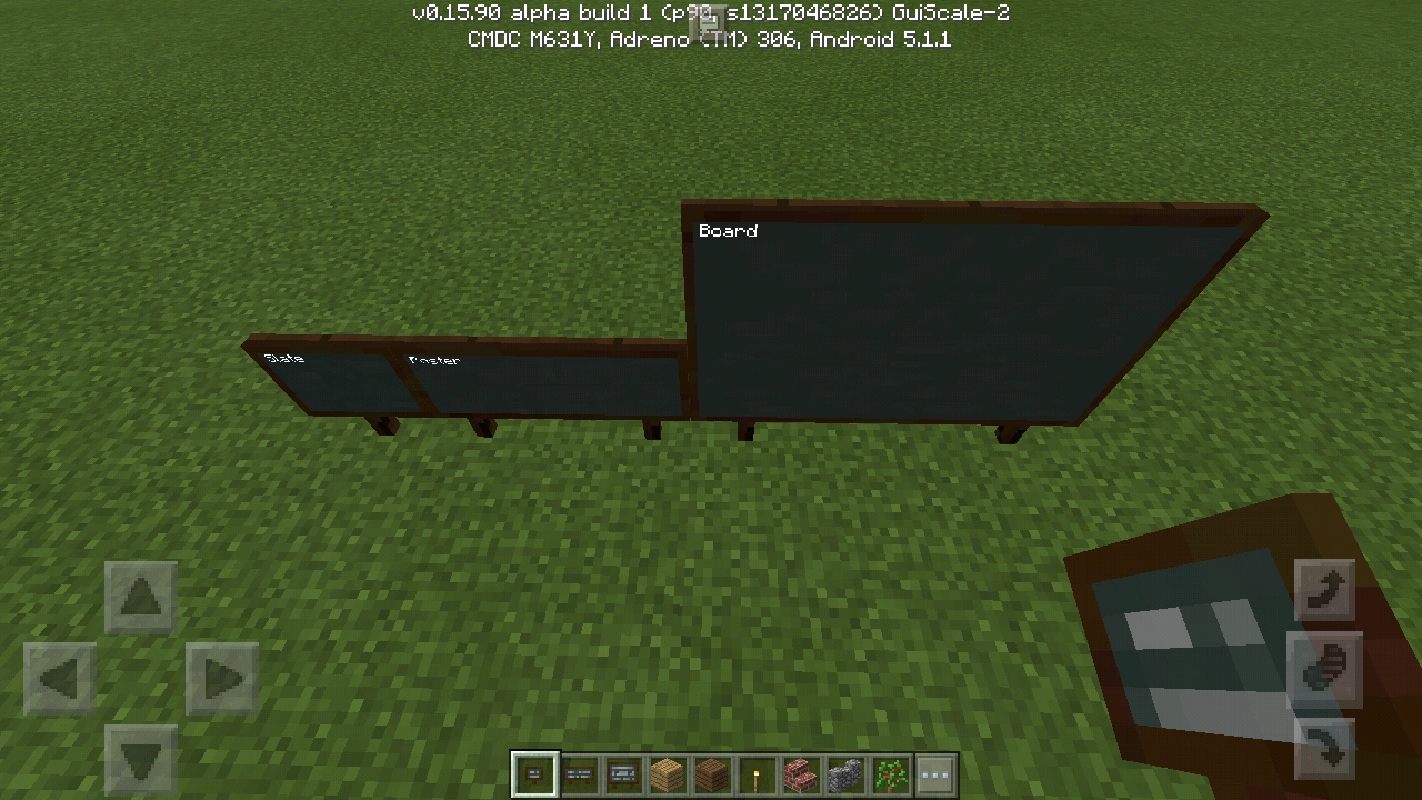Шифер размером 1×1, размещен на верхней части блока, стоят на короткой стойке, обращенной в направлении игрока, который его разместил, в любом из 16 различных направлений. Плакаты 2×1 и доски 2×3 можно размещать в любом из 4 различных направлений. Доски, расположенные на стороне блока, просто плавают там, даже если блок не соприкасается с досками.