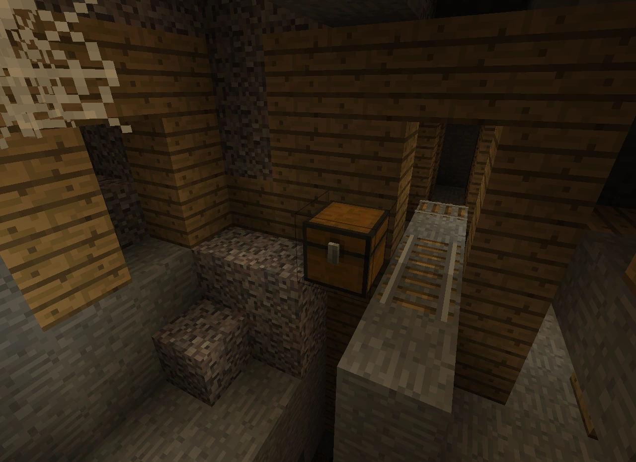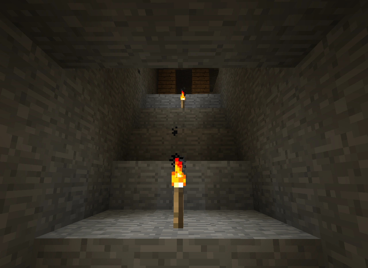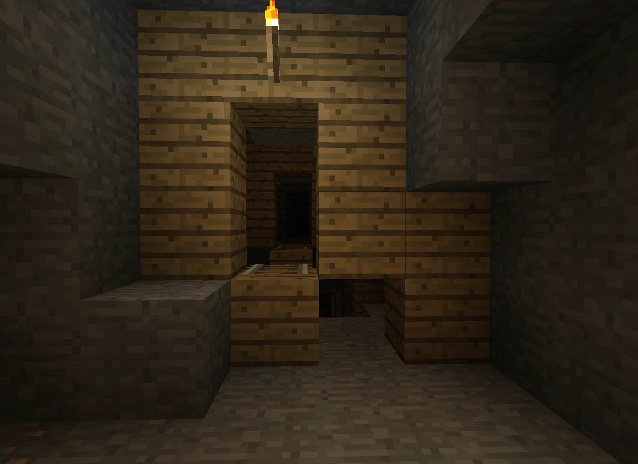 В шахтах стоят П-образные опоры из досок и заборов через каждые 3-4 блока, что сильно помогает с проблемой нехватки дерева для крафта инструментов и факелов. Некоторые места освещены факелами.