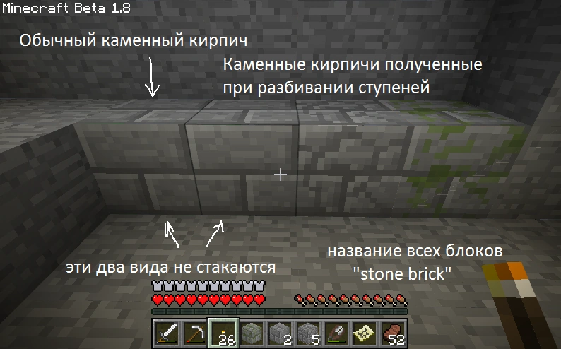 | 1.8-pre2 | Потрескавшиеся и замшелые каменные кирпичи теперь дропают самих себя, а не блок обычного каменного кирпича. | ||||