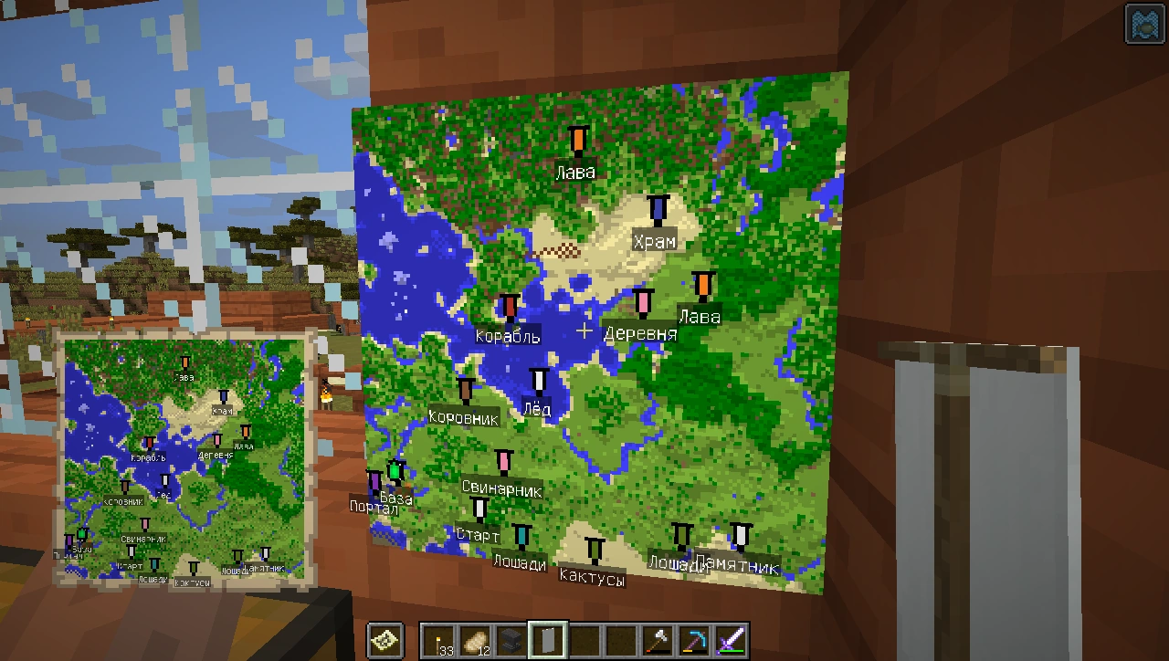 Вы путешествуете по миру с картой в руках и нашли интересное место, которое хотите пометить на карте. Для этого необходимо совершить два действия. Во первых создайте копию карты находящейся в ваших руках, поместив карту и чистую карту на верстак. Во вторых, найдите вертикальную поверхность, разместите на ней рамку и в неё вставьте копию карты. В результате, на карте в ваших руках и на копии размещённой в рамке появится метка зелёного цвета. Для удаления метки с карты — выньте копию карты из рамки. Зелёная метка исчезнет. При закрытии мира и повторном заходе все зелёные метки с карт исчезают. Для восстановления отображения меток, достаточно подойти к месту, с копией карты в рамке, на расстояние установленной у Вас границы отображения чанков.