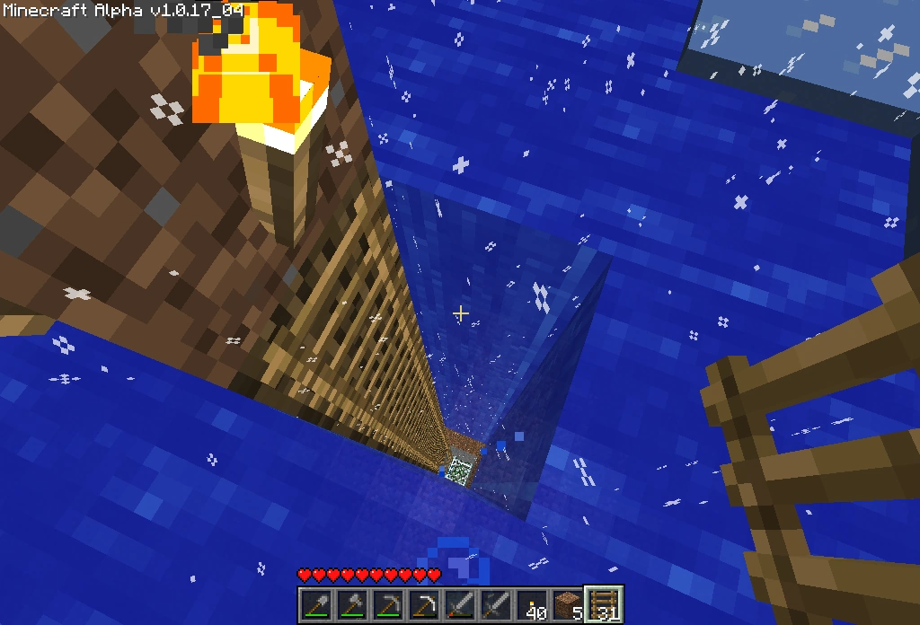 Хотя лестница визуально занимает немного места в блоке, с точки зрения игры она заполняет блок целиком, как, например, булыжник. Из-за этого вода не заполняет этот блок и лестница замещает собой воду (см. галерею). Это можно использовать при спуске на дно океана, чтобы не терять шкалу дыхания. При перемещении по океаническому дну можно пользоваться дверьми, которые обладают тем же самым свойством. Также следует помнить о том, что в новых версиях игры шкала дыхания восстанавливается не мгновенно и для того, чтобы отдышаться, надо немного подождать.