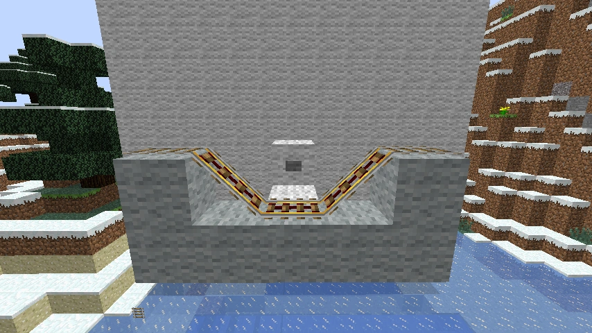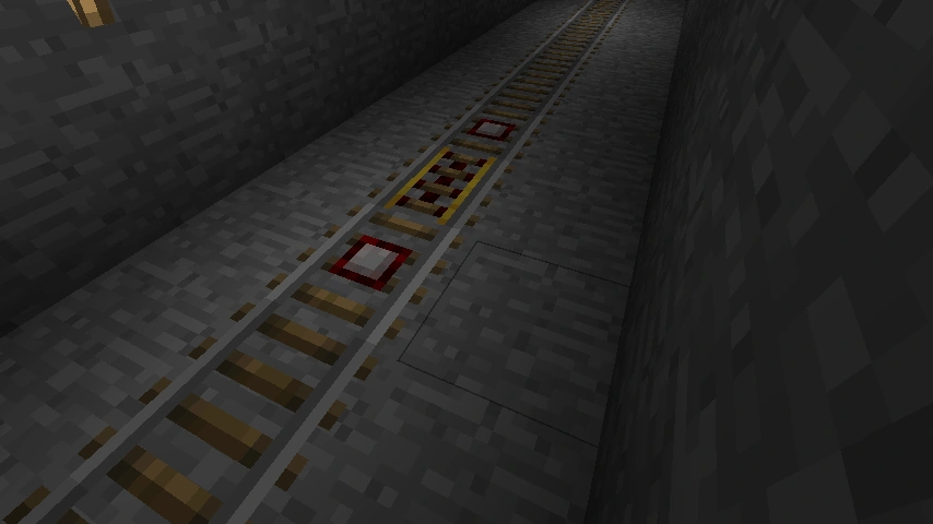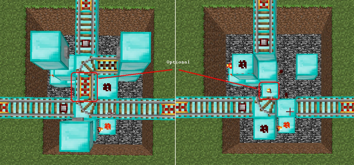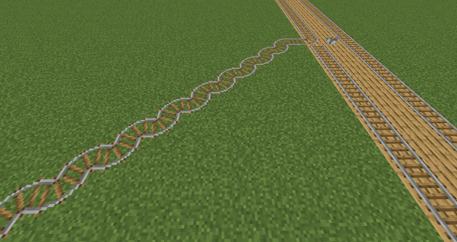 Если расположить рельсы как на картинке справа, вагонетка, несмотря на кажущуюся невозможность нормальной поездки, будет нормально двигаться по прямой, без тряски. Хоть она и будет колебаться между двумя противоположными положениями, но игрок заметит это только по изменению текстуры, на механику это не влияет, даже вагонетка с печью продолжит нормально ехать. Это увеличивает возможности железнодорожных коммуникаций по охвату территории, также позволяет делать более округлые повороты, на которых трясет заметно меньше.