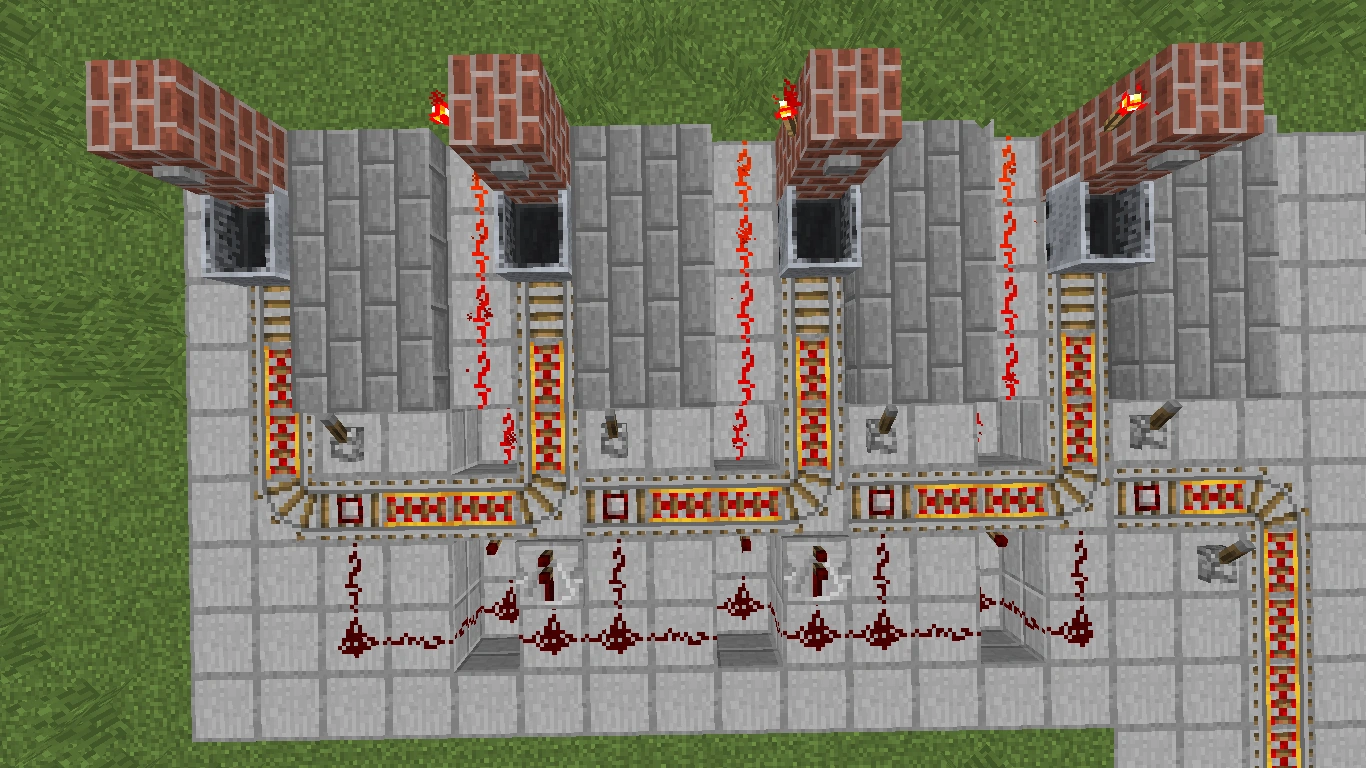 Чтобы своевременно определять состояние путей (целы они или разрушены), можно проложить вдоль них дорожку из красной пыли с повторителями и запитать её в начале красным факелом. Если провод будет задет взрывом, он «погаснет».