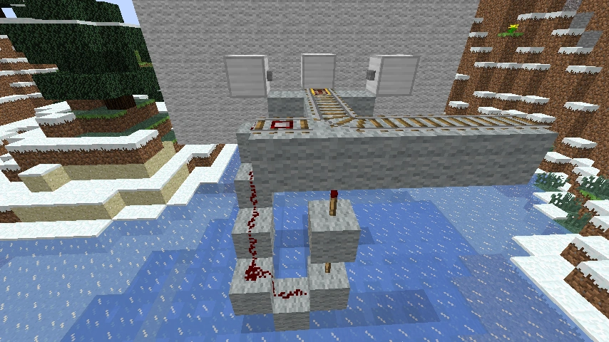 При постройке станции сначала нужно проложить рельсы, снести изогнутый рельс и поставить снова. После чего провод к нему необходимо положить от кнопки, противоположной стороне изогнутости рельсов (как на картинке). Не забудьте поставить рельс-кнопку с этой же стороны, иначе вагонетки будут проскакивать эту станцию. И не забывайте снимать вагонетки с рельсов после использования, или сделайте автостанцию вроде этой: