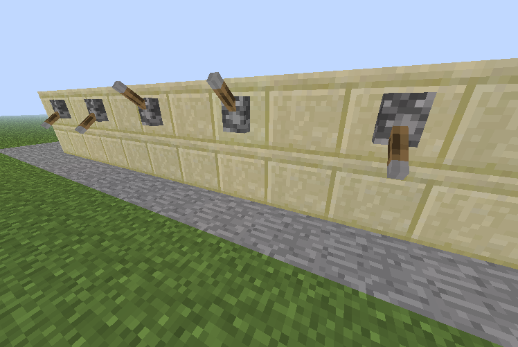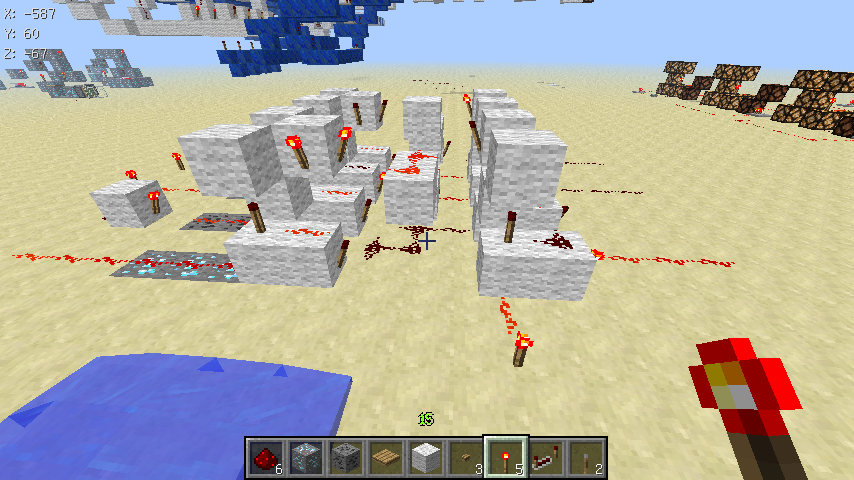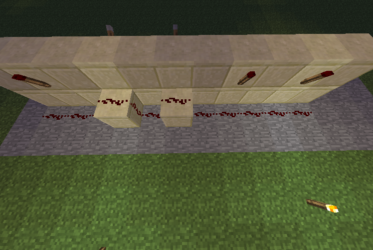 3. Обходим нашу схему с тыльной стороны и на тех блоках, где у нас установлены рычаги в нижнем положении, вешаем красные факелы. Они сразу должны потухнуть. Это будет значить, что вы поставили их верно
