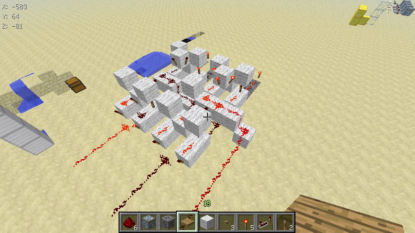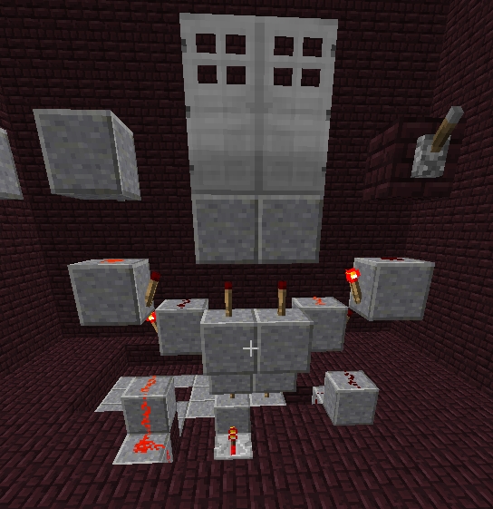 Давайте попробуем это построить! На блоках с «правильными» рычагами ставим красные факелы, неправильные же просто замыкаем напрямую к цепи. Дальше ставим инвертор и дальнейший сигнал подводим к AND Gate, на втором входе которого стоит «засов». Вот и все, ставим дверь и готово.