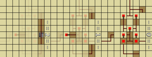 Через рычаги 0 (на схеме) будет вводиться код для открытия двери (я пишу про дверь, потому что это одна из двух вещей, на которую можно взаимодействовать током). Рычаги 1 определяют какие из рычагов 0 будут «правильными». Рычаг 2 — это «засов» (если факел над «засовом» горит, то он «задвинут»). А 3 — выход идущий к двери.