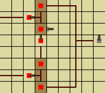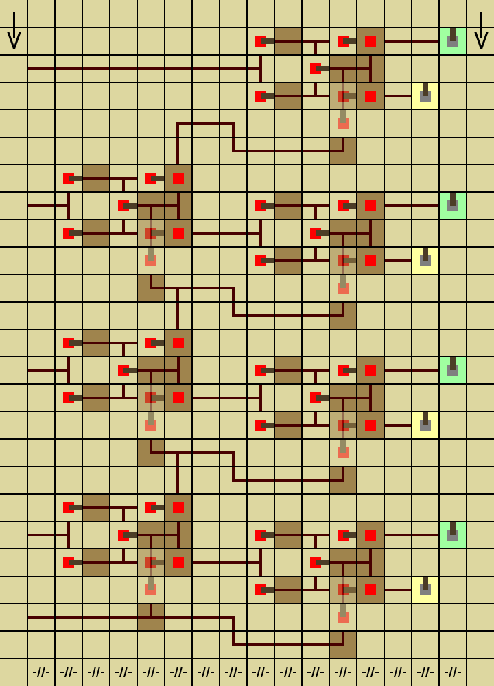 В такой схеме сигнал на выходе появляется практически сразу при подаче на вход, а исчезает спустя некоторое время после снятия входного. Каждые два повторителя представляют собой звено, которое может поддерживать сигнал до 0,4 с. Повторители, идущие в одну линию, настраиваются для достижения нужной длительности поддерживания сигнала, поперечные — в режиме минимальной задержки. Необходимо также помнить о правиле 15 клеток для выходной линии (той, что идет после поперечных повторителей).