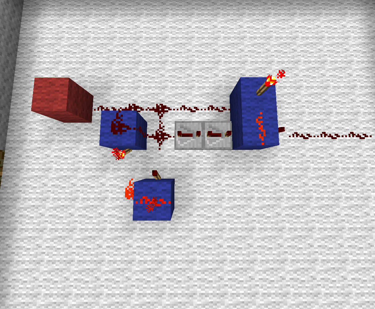 Простой переключательСобственно ничего сложного. Рычаг либо включает факел и выключает нижний провод, либо наоборот. A если добавить AND вентиль, то возможна блокировка. | ![]() Простой переключатель |