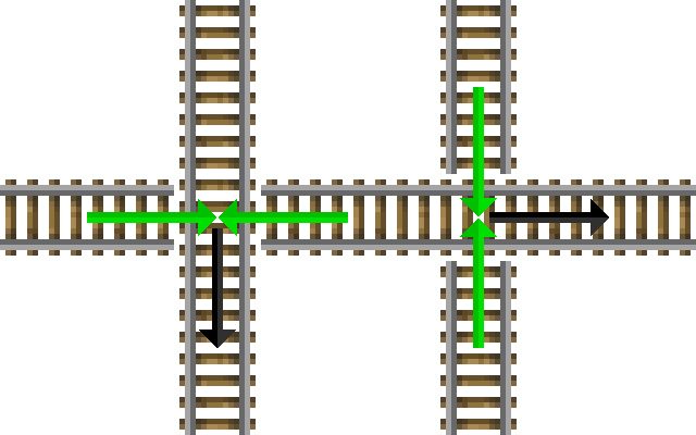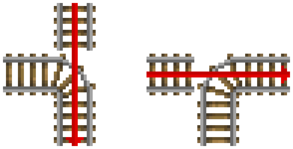 Если к наклонному участку пути подвести перпендикулярные рельсы, при прохождении по последнему вагонетка поедет вниз. При выполнении этого правила, исключается правило юго-восточного угла.
