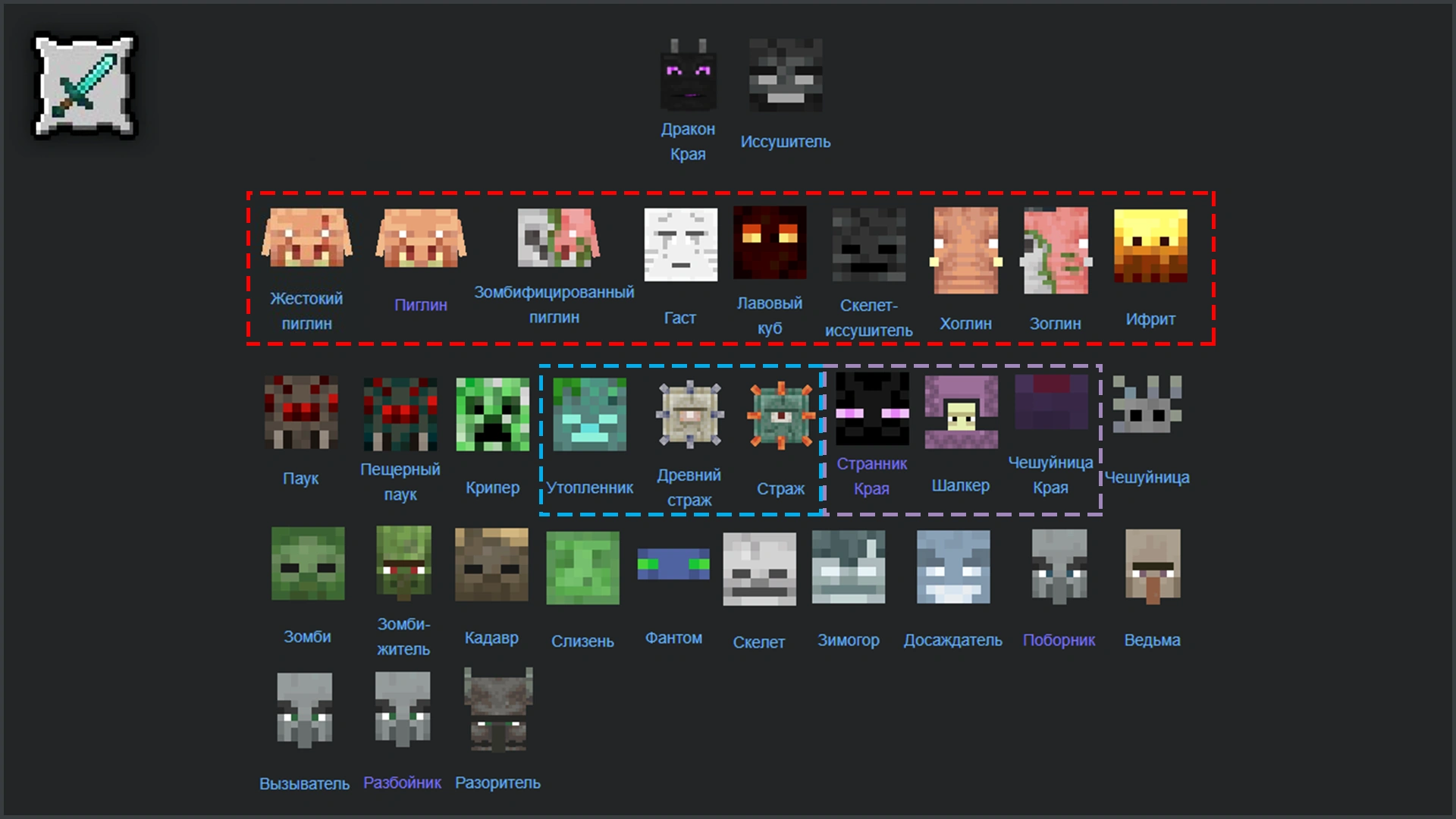 Достижение-испытание-невып.pngЗверобой Убейте по одному монстру каждого видаОхотник на монстровУбейте каждого из этих 34 монстров.minecraft:adventure/kill_all_mobs100 Сфера опыта-тех.gif