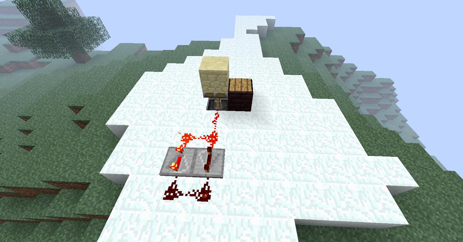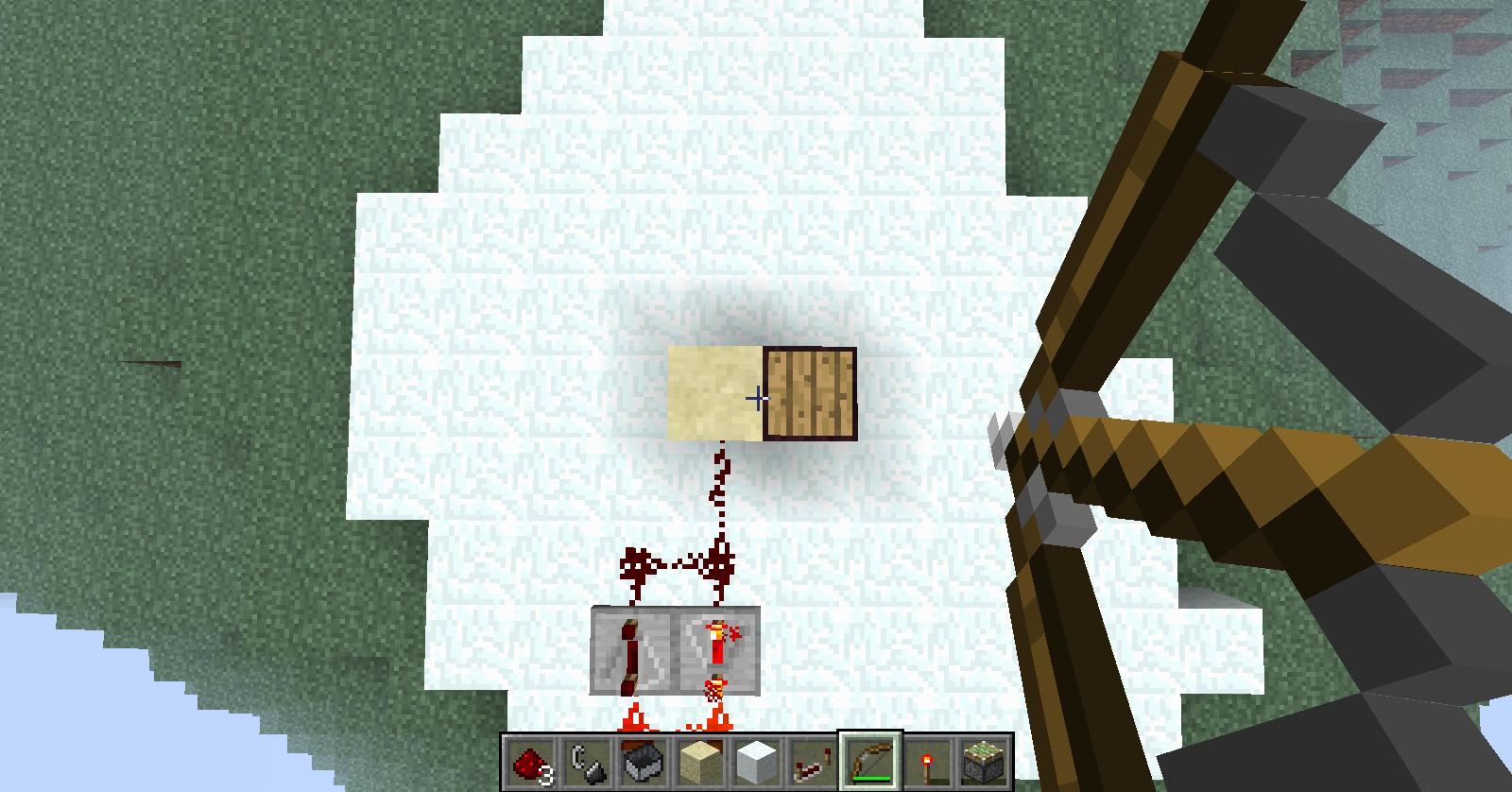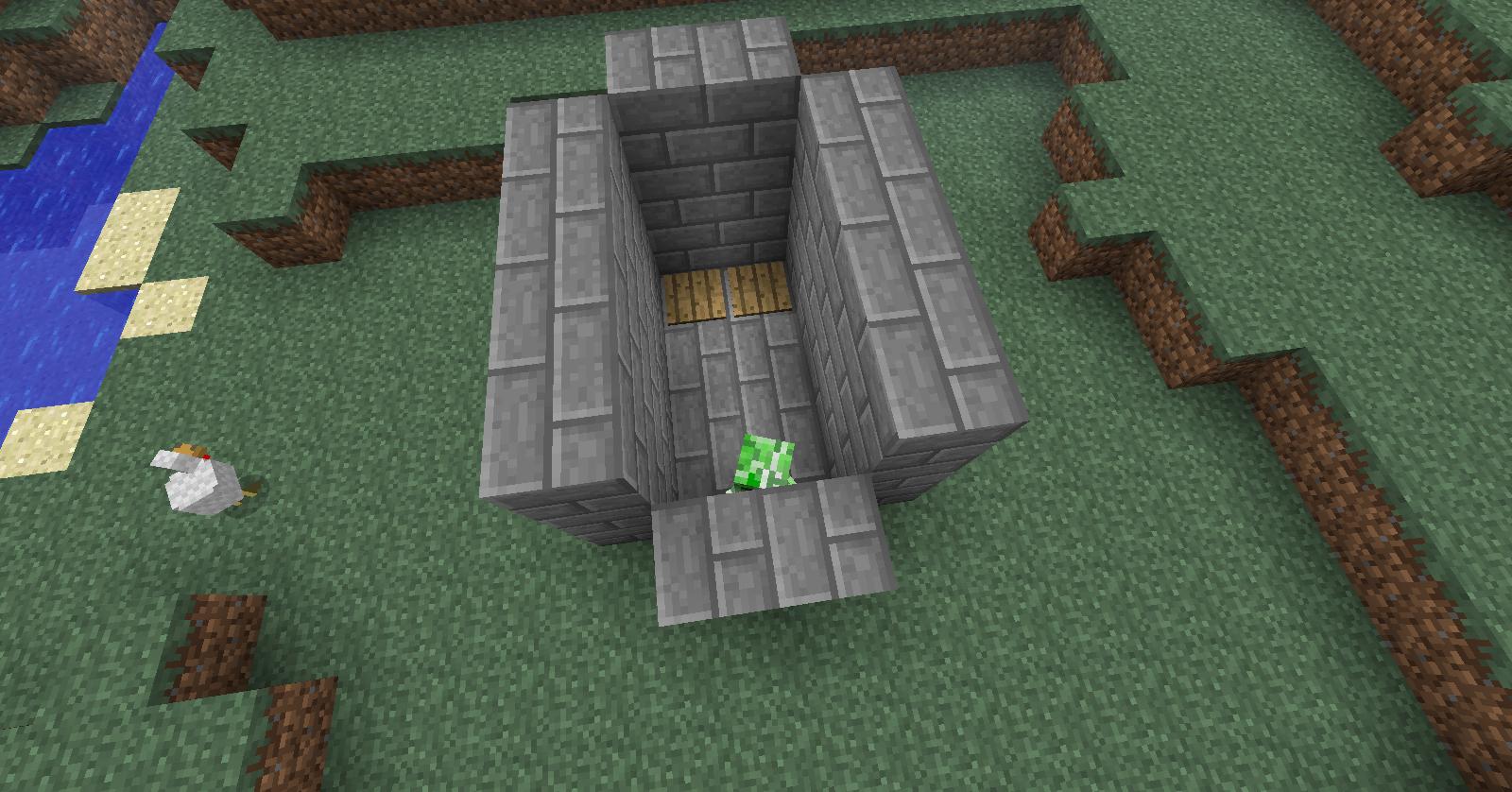 Всю постройку можно описать всего лишь одним скриншотом. Надо построить небольшую "комнатку", размеры, форма и расположение кнопки в которой зависят от здания, где расположена СУД. Осталось только "поселить" туда крипера и радоваться тому, что твою систему не взорвали.