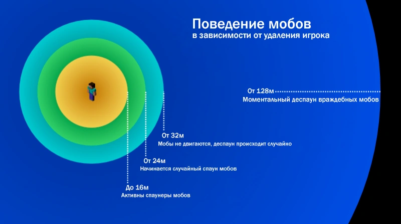 Различные ступени поведения мобов в зависимости от удаления игрока от них.