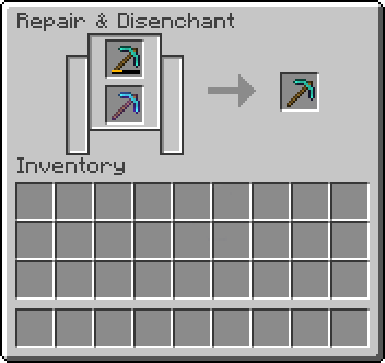 Если во входные слоты поместить один или два повреждённых инструмента одного типа, в выходном слоте появится новый инструмент, свойства и уровень прочности которого будут прямо зависеть от двух повреждённых инструментов.