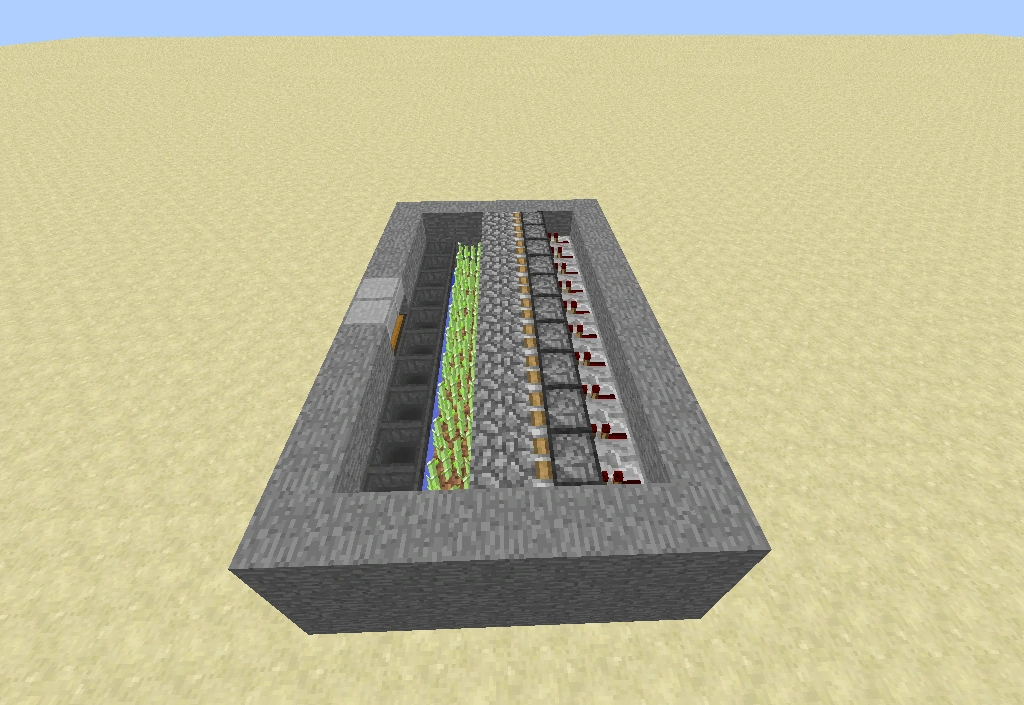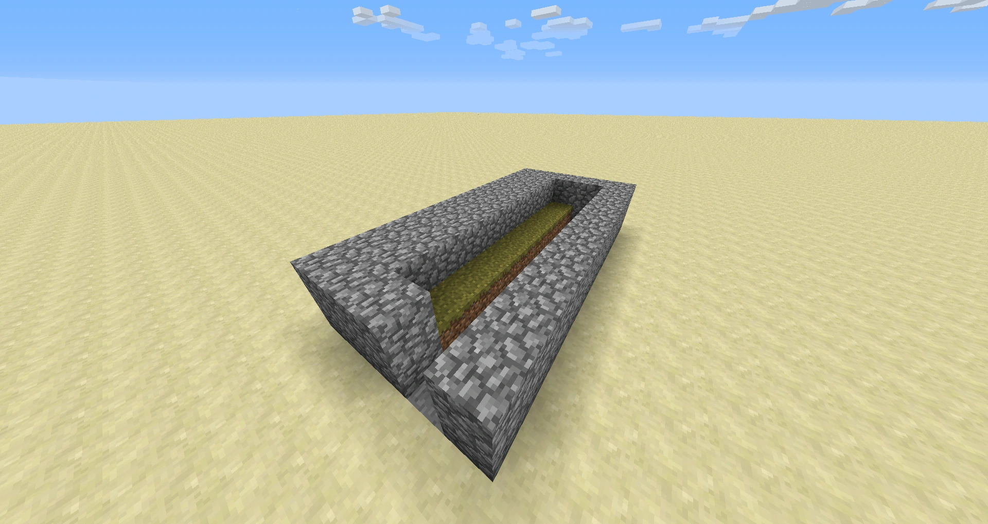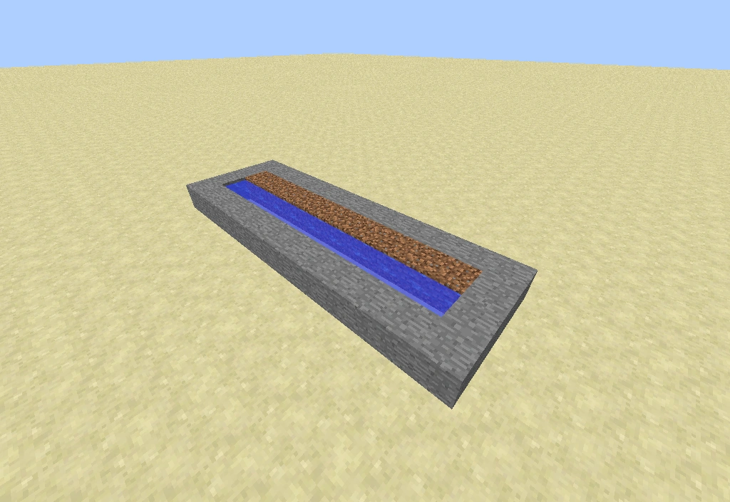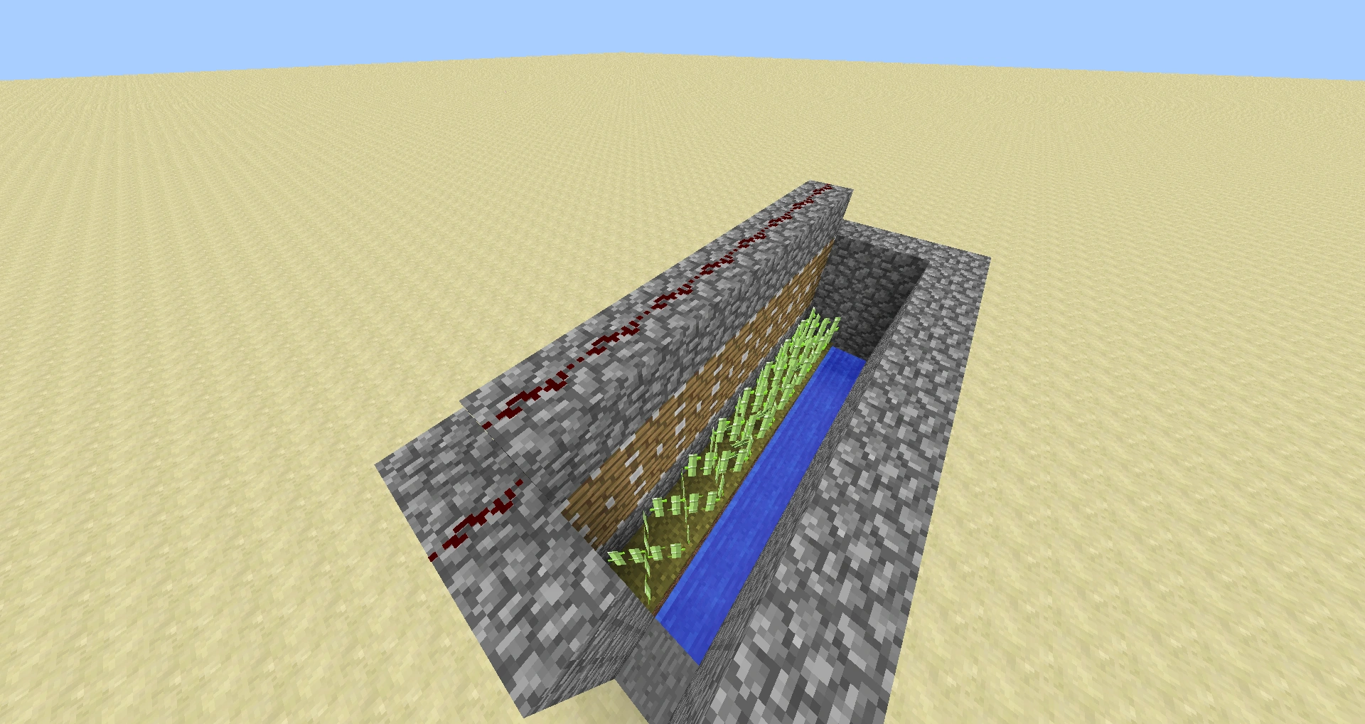 Затем следует выкопать канаву с водой произвольной длины, однако она должна быть расположена на расстоянии 2 блока от проекции липкого поршня в сенсорном механизме на горизонтальную поверхность. После этого следует закрыть канаву сверху любыми блоками, на которые возможно устанавливать поршни, а со стороны, где расположен сенсорный поршень, посадить ряд тростника. Главное, чтобы один из блоков с тростником был расположен возле сенсорного поршня, и чтобы при росте тростник «касался» его.