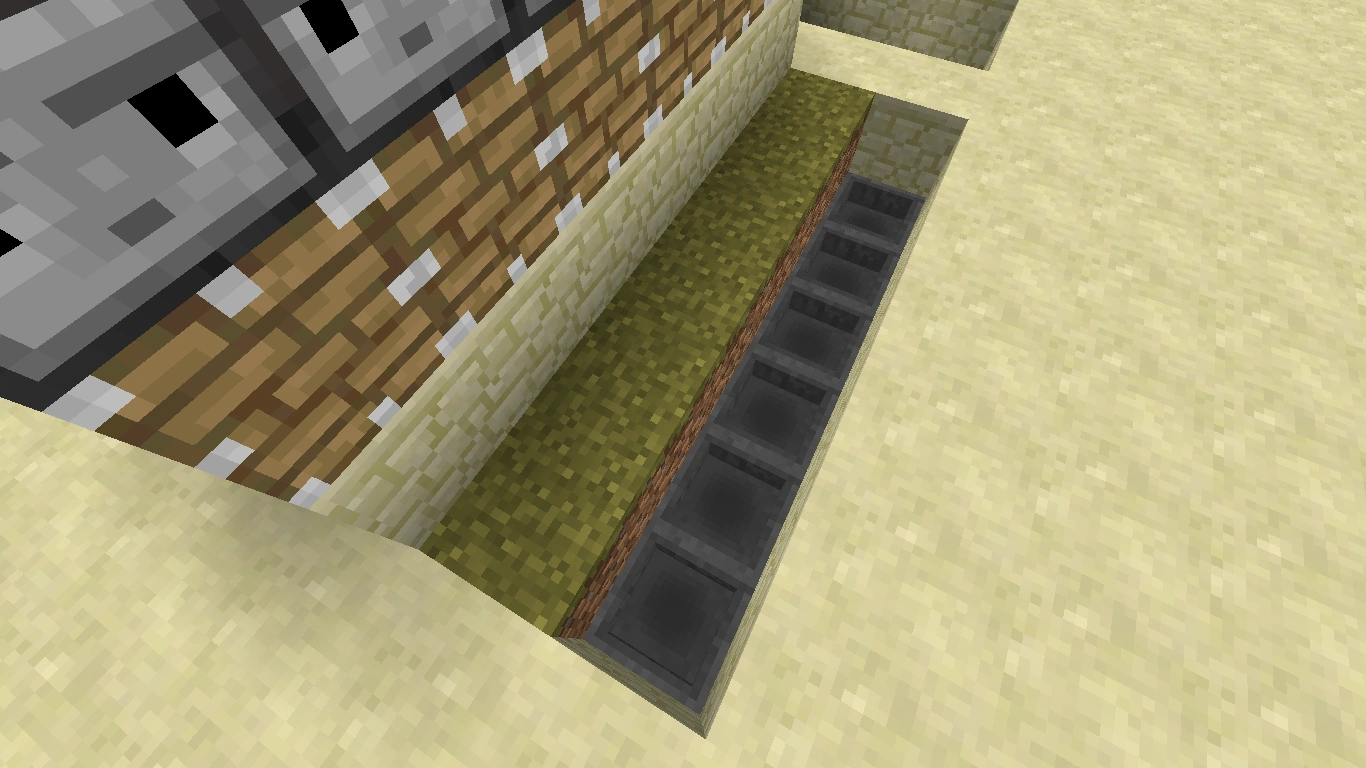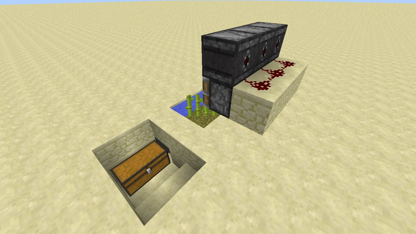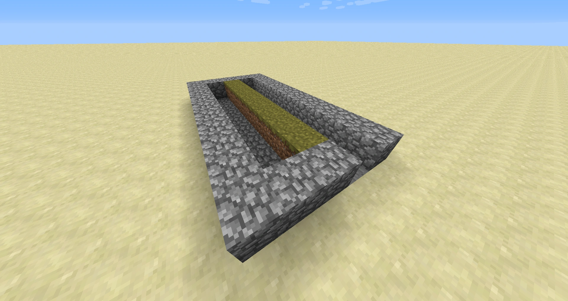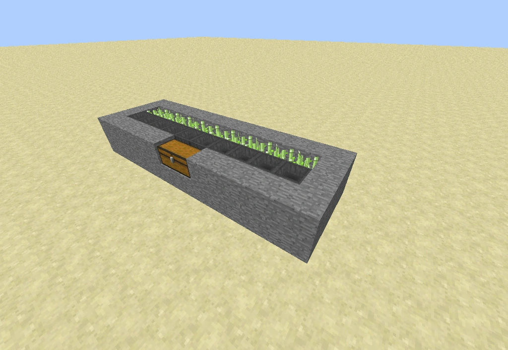Затем следует выкопать канаву с водой произвольной длины, однако она должна быть расположена на расстоянии 2 блока от проекции липкого поршня в сенсорном механизме на горизонтальную поверхность. После этого следует закрыть канаву сверху любыми блоками, на которые возможно устанавливать поршни, а со стороны, где расположен сенсорный поршень, посадить ряд тростника. Главное, чтобы один из блоков с тростником был расположен возле сенсорного поршня, и чтобы при росте тростник «касался» его.