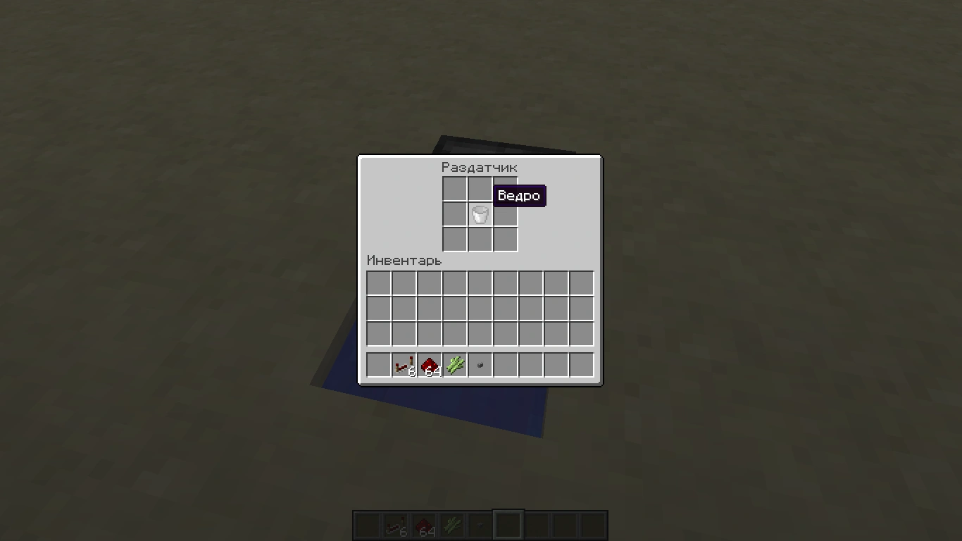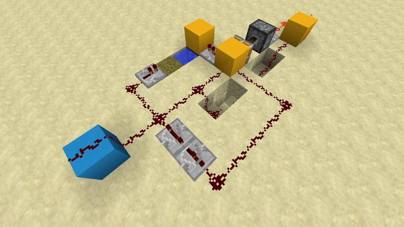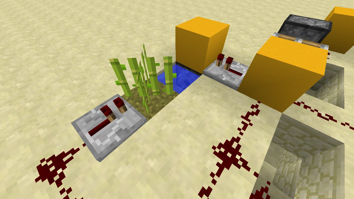 После нажатия на кнопку красная пыль активирует раздатчик с ведром, раздатчик забирает воду в ведро, после чего красная пыль активирует сахарный тростник, что приводит к его обновлению. Так как воды около тростника нет, он срубается, после чего снова активируется раздатчик, который снова выливает воду.
