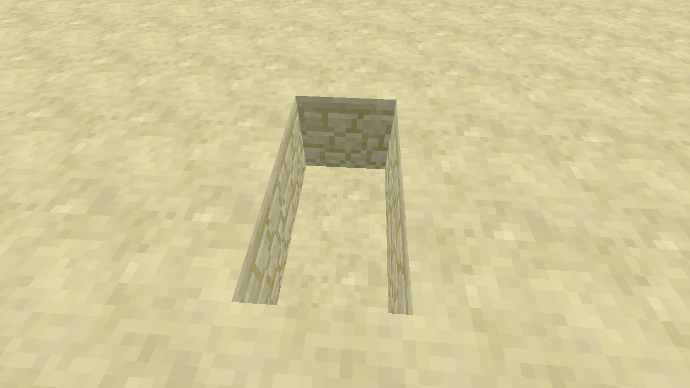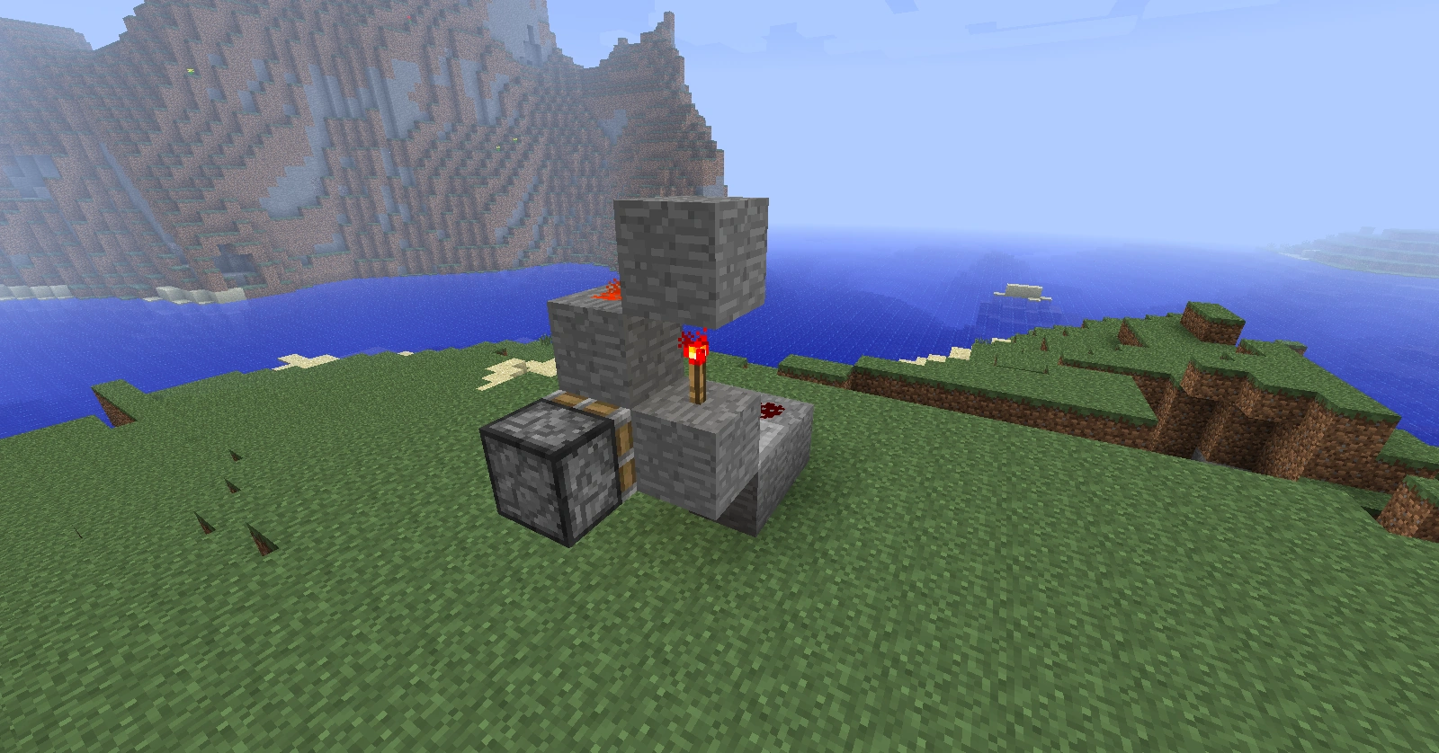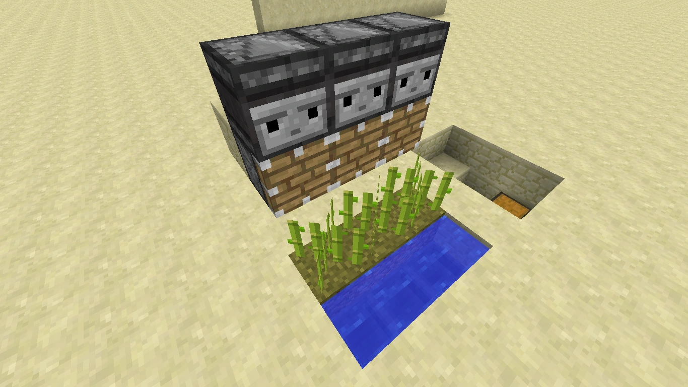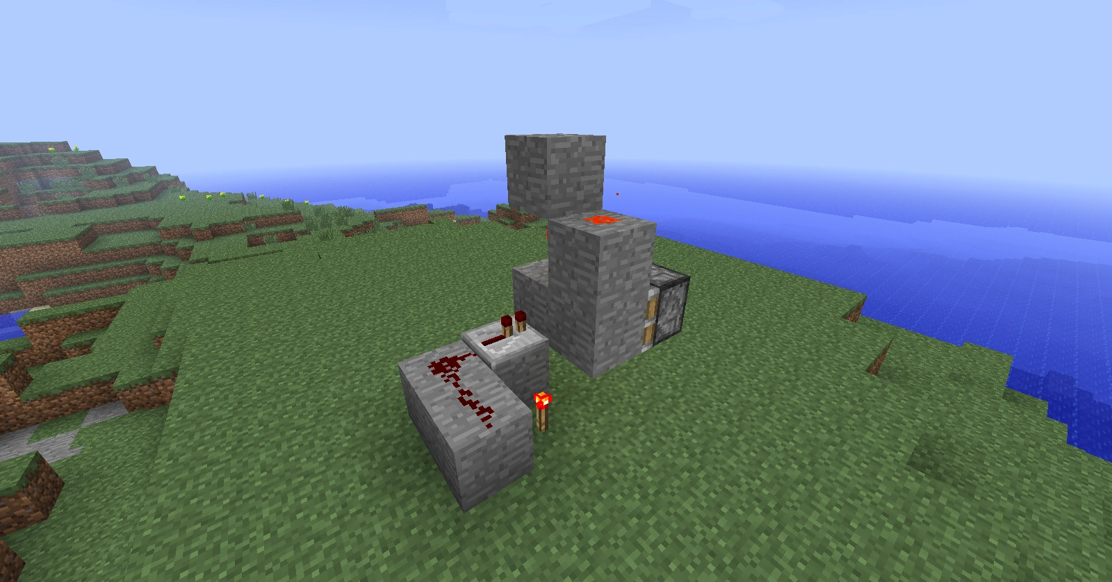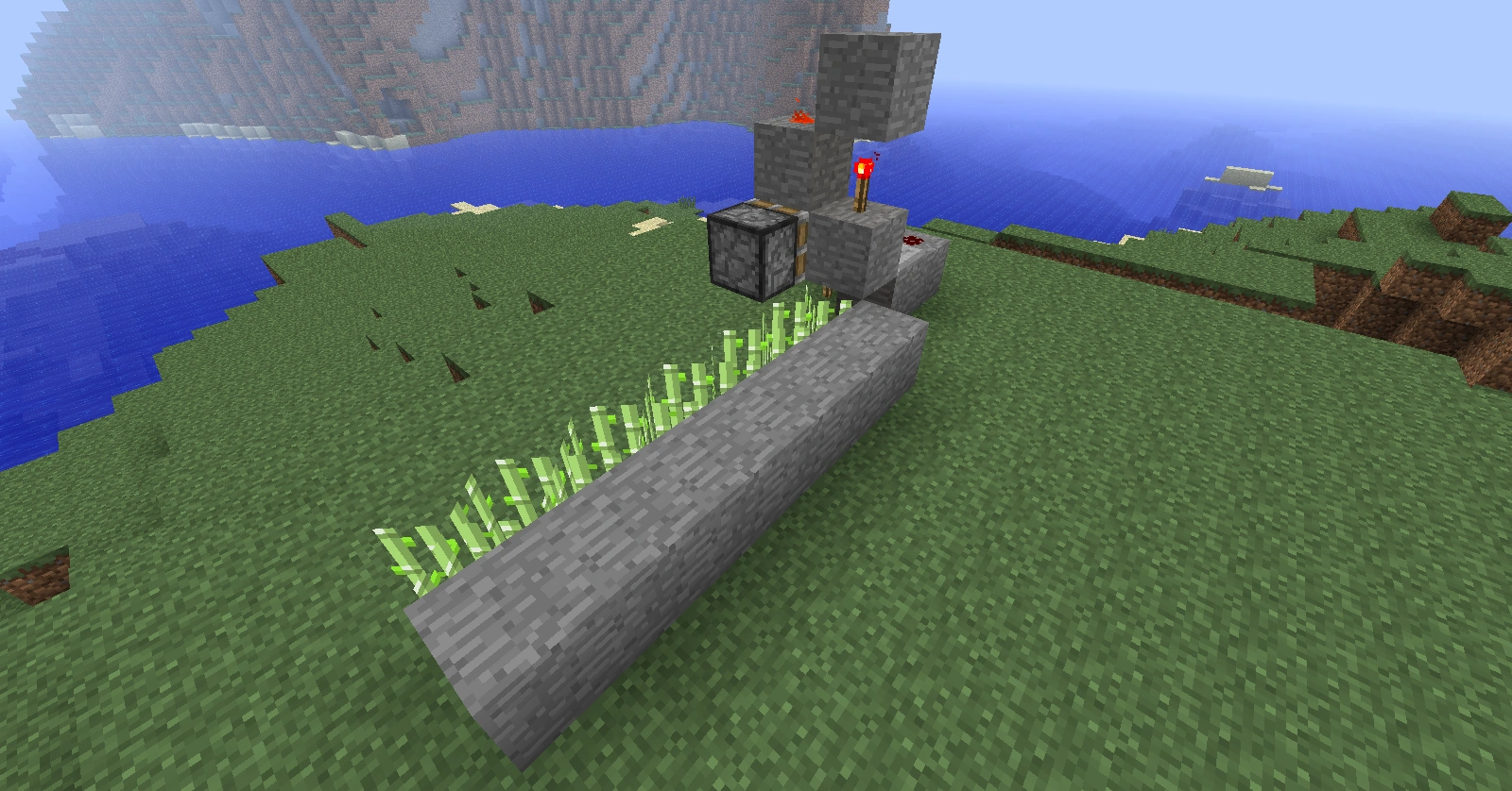 Затем закройте сверху воду двумя вертикальными рядами блоков булыжника и поднимите другие стенки на один блок. Далее расположите над только что установленным рядом булыжника над водой два вертикальных ряда поршней любого типа, но так, чтобы при активации сами поршни высовывались в сторону места для посадки тростника, то есть бордюра из грязи. (Меньше затрат составляет конструкция, состоящая из одного ряда поршней, так как при удалении нижнего блока тростника выпадают и верхние, также существует ошибка с возвращением верхнего ряда поршней)