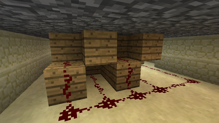 Выбрана конструкция ДОБ-а на основе блоков красного камня и квазисоединимости поршней, как наиболее компактная и простая. Принцип действия: при изменении блока, примыкающего к датчику (в данном случае — левый поршень), поршень срабатывает.