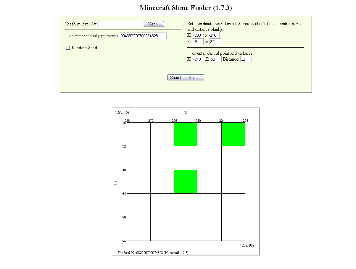 Проще всего ввести свои координаты (которые можно узнать с помощью кнопки F3 во время игры) и радиус поиска от 16 до 64 клеток (дабы было не очень далеко). При нажатии кнопки выведется сетка из белых и зелёных квадратов. В чанках, помеченным зелёным, и будут спауниться слизни.