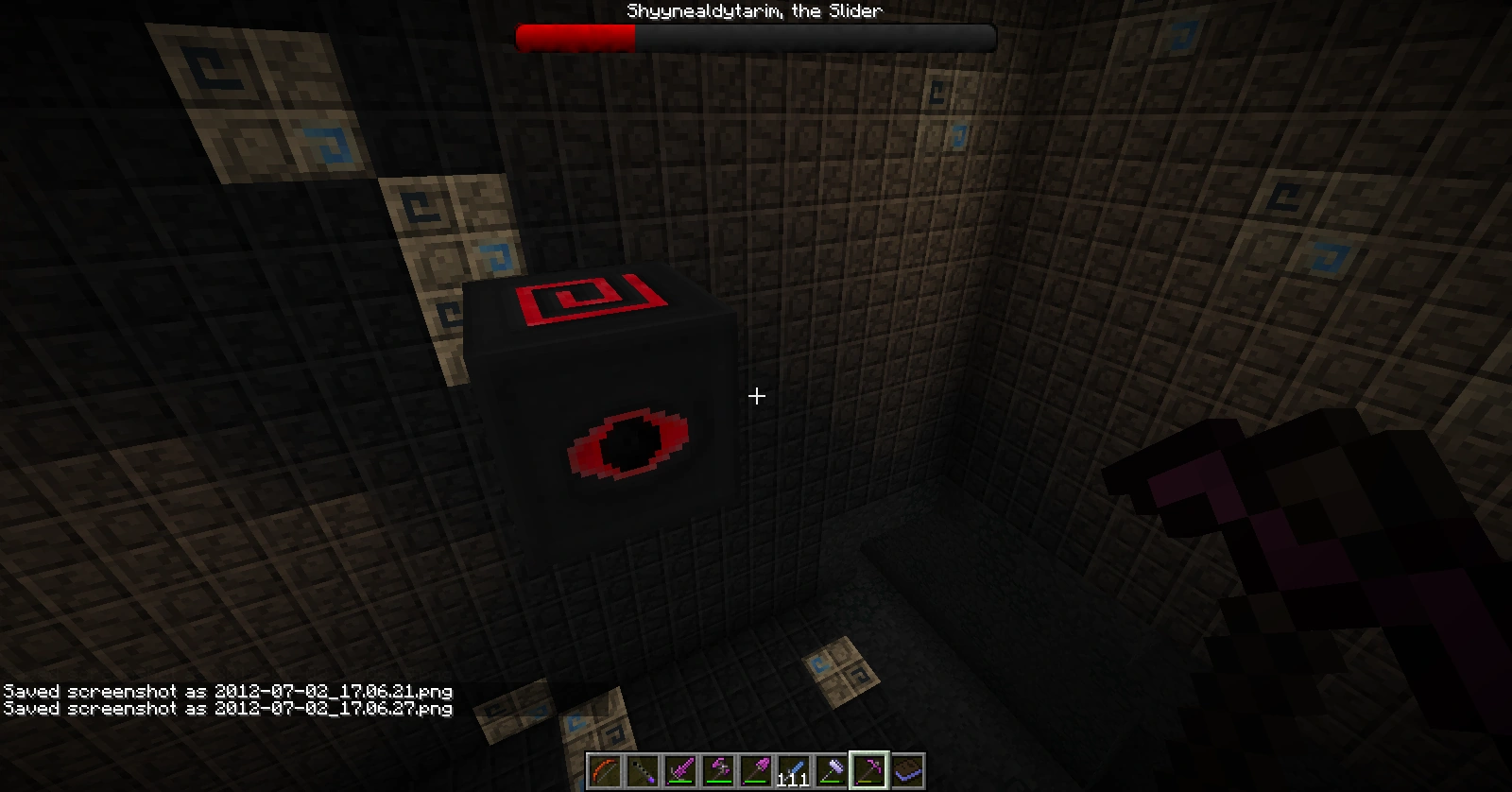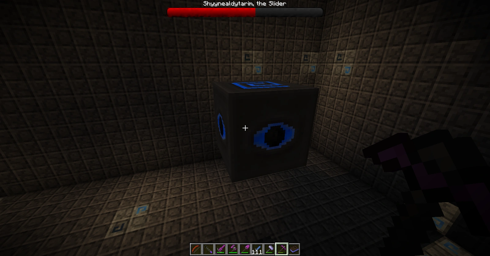 ) единиц урона (если у вас нет брони). Дополнительно вас будет высоко подбрасывать, что приведёт к урону от падения. Не пытайтесь поставить блоки, он ломает любые из них, но в режиме Creative вы можете разрушить сокровищницу и улететь, а сам Слайдер останется там. Он двигается исключительно по прямой, как бы скользя. При полном уровне жизни он стремится загнать вас в угол и подбросить. При падении уровня его здоровья менее 50% иногда он будет пытаться раздавить вас, заходя сверху. После того, как у него останется 25% здоровья, его узор и глаза покраснеют. В этом режиме он начнёт двигаться гораздо быстрее. Основная тактика боя — атаковать его сбоку, постоянно перемещаясь, чтобы не находиться на линии его движения. Так что двигайтесь очень быстро и не забывайте отбиваться киркой.