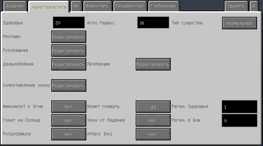 - Поле "Реген. Здоровья" — отвечает за возможность восстанавливать здоровье в указанном размере один раз в 2,5 секунды, если NPC находится не в бою.