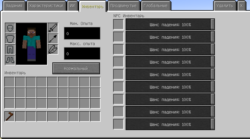 - 9 полей справа — в слоты устанавливается предмет или блок, который выпадет при убийстве NPC, а ползунком рядом указывается шанс в %, что выпадет именно этот блок или предмет. Могут выпасть все 9, если шанс позволит.