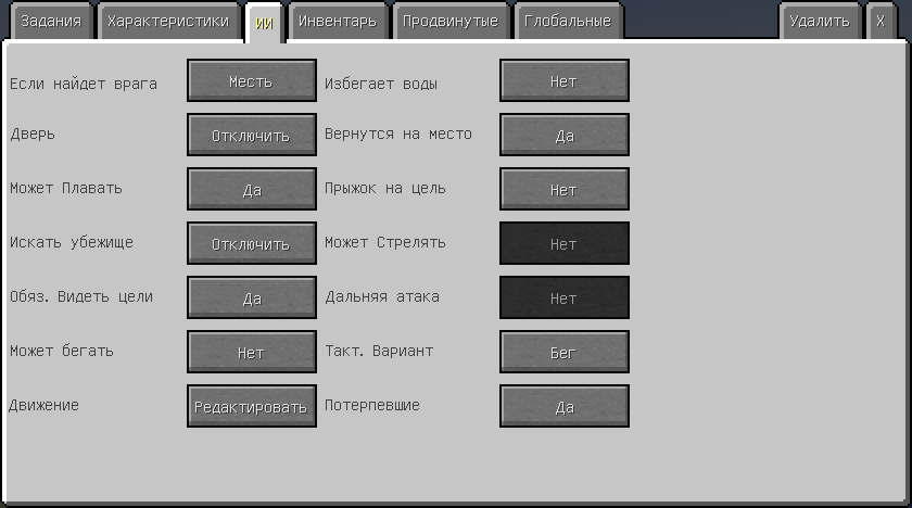 - Позиция "Может стрелять", кнопки "Нет, Когда расстояние, Когда скрытый" — (с версии 1.8.0 эта кнопка убрана, тактика ведения боя всех мобов была изменена.) отвечает будет ли NPC использовать свои настройки «Дальней атаки» (см. выше характеристики). Чтобы было можно включить эту кнопку, NPC необходимо дать патроны (см. ниже инвентарь). Соответственно «Нет» — не стреляет, «когда расстояние» — стреляет в пределах своего Агро и Дальности атаки, «Когда скрытый» — NPC стреляет, если невидим