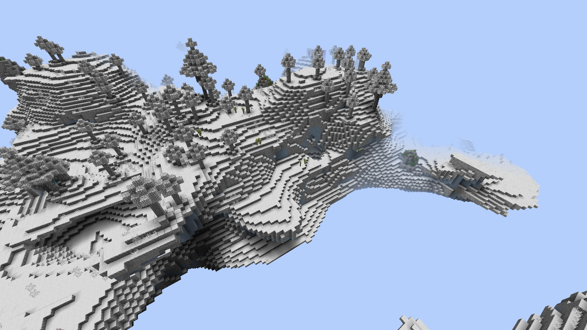 | Заснежье | | Мир представляет собой огромные равнины с частыми и высокими деревьями. Чтобы попасть в него, необходимо построить рамку портала из блоков снега и активировать снежным шаром. Иногда происходят перепады высот, выглядящие как утёсы. Также, тут можно встретить небольшие мастерские. Под землёй встречаются пещеры, как и в обычном мире, но они лишены всяких руд. Часто там генерируются сокровищницы. Внутри них есть замороженные сундуки, в которых хранятся снежинки, использующиеся как валюта при торговле с местными торговцами. |