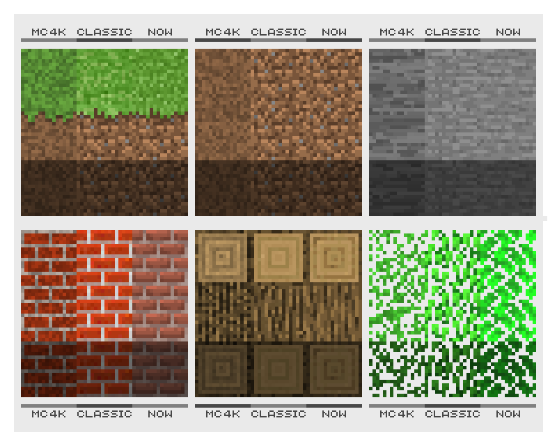 Сравнение текстур из Minecraft 4K с их аналогами из MCJE Classic и MCJE 1.14
