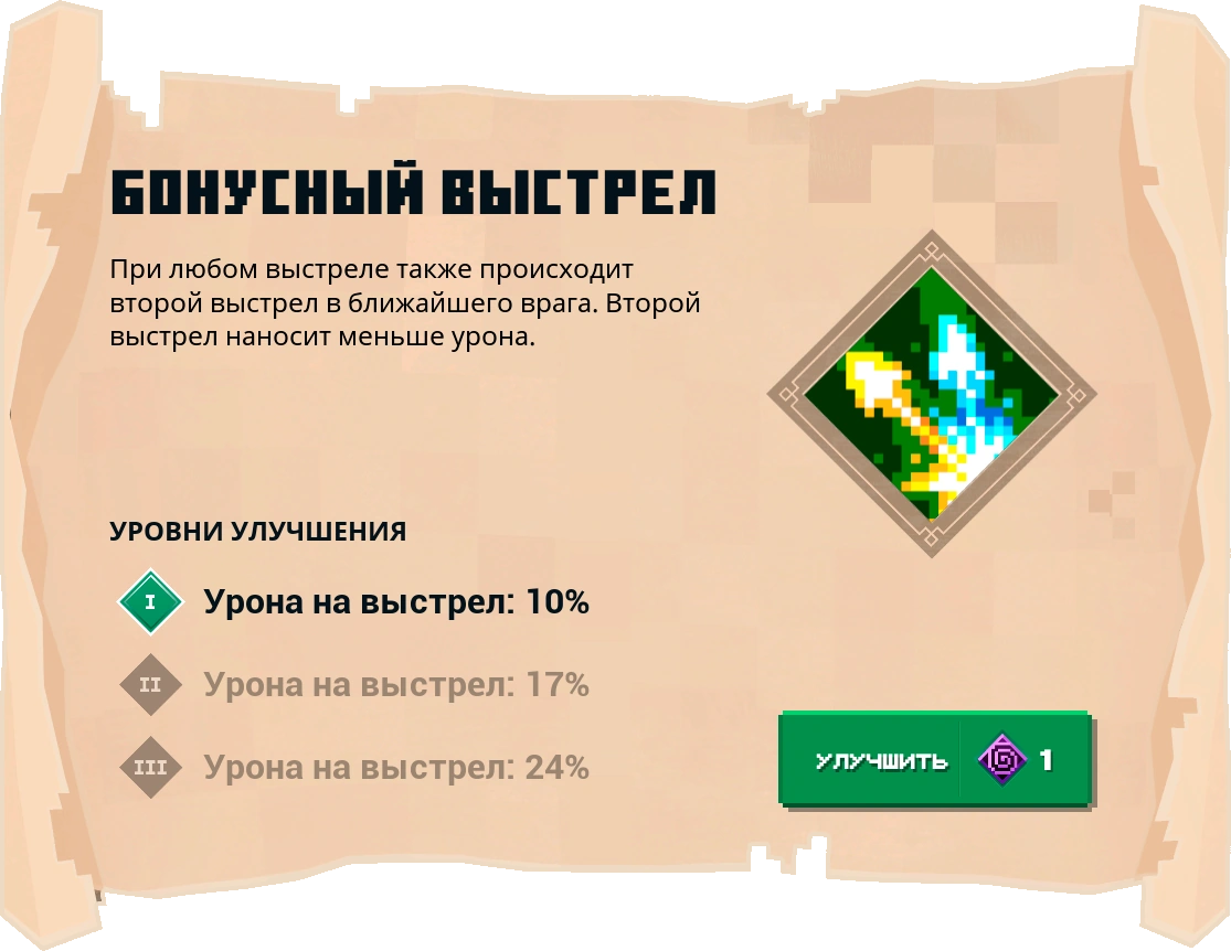 Бонусный выстрел (англ. Bonus Shot) — это чары в Minecraft Dungeons, которые при стрельбе из лука также выпускают вторую стрелу в направлении ближайшего врага. Однако вторая стрела всегда будет наносить меньше урона, чем основная. Количество урона, наносимого второй стрелой, увеличивается с каждым уровнем улучшения.