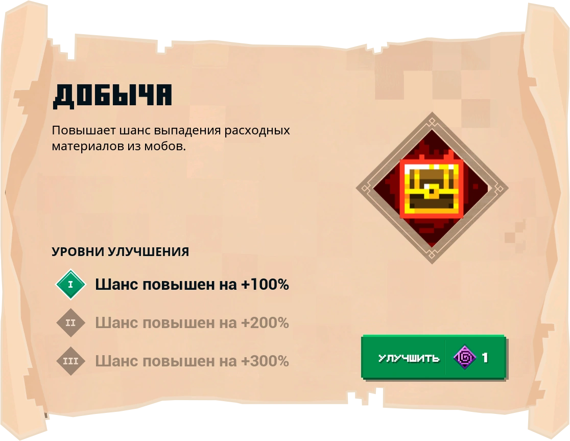 | I | Шанс повышен на +100 % | 1 очко зачарований |