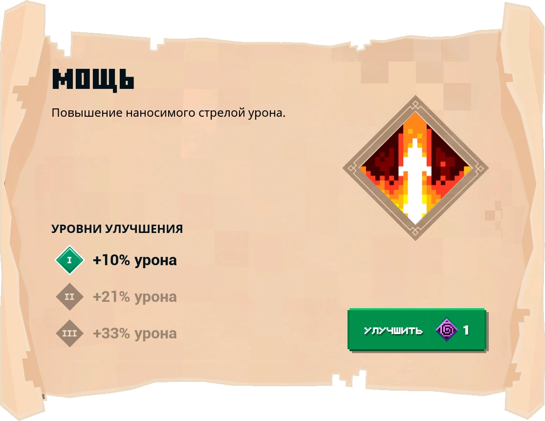 Мощь (англ. Power) — это чары в Minecraft Dungeons, которые увеличивают урон от стрел. Урон будет увеличиваться с каждым уровнем улучшения.