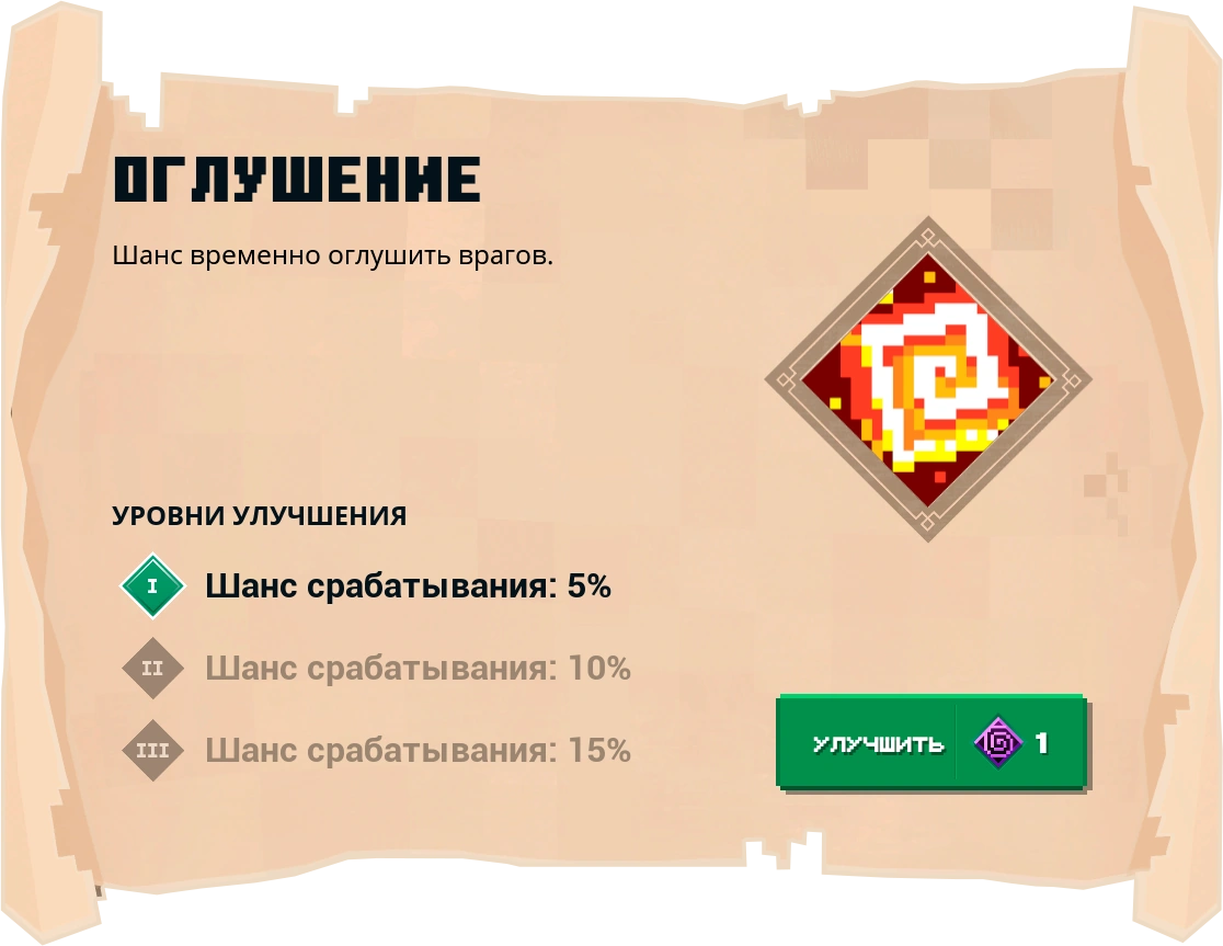 | II | Шанс срабатывания: 10 % | 2 очка зачарований |