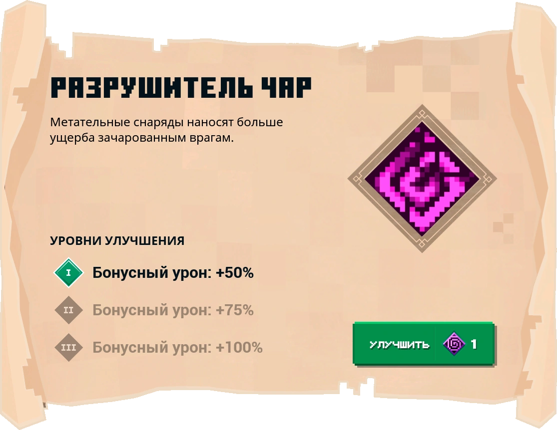 | I | Бонусный урон: +50 % | 1 очко зачарований |