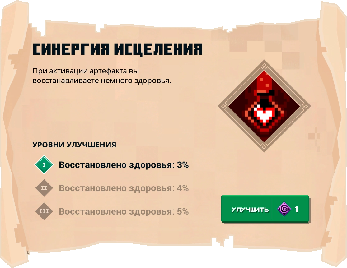 Синергия исцеления (англ. Health Synergy) — это чары в Minecraft Dungeons, которые немного исцеляют игрока каждый раз, когда активируется артефакт. Количество восстановленного здоровья увеличивается с каждым уровнем улучшения.