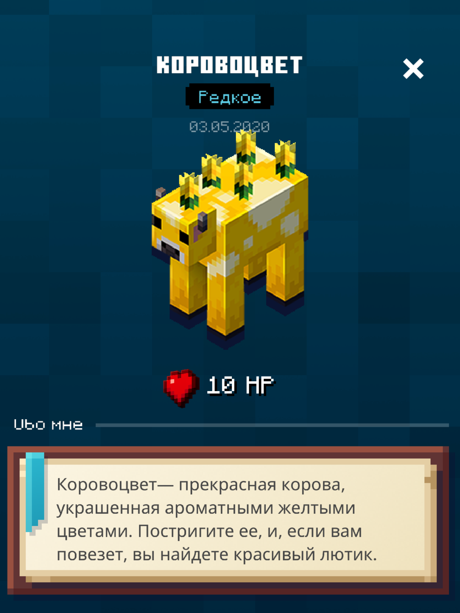 Лютиковая корова по шкале редкости Minecraft Earth относится к редким мобам. Её можно встретить в корове с 0,7 % вероятностью.