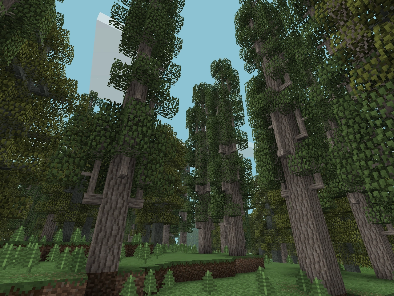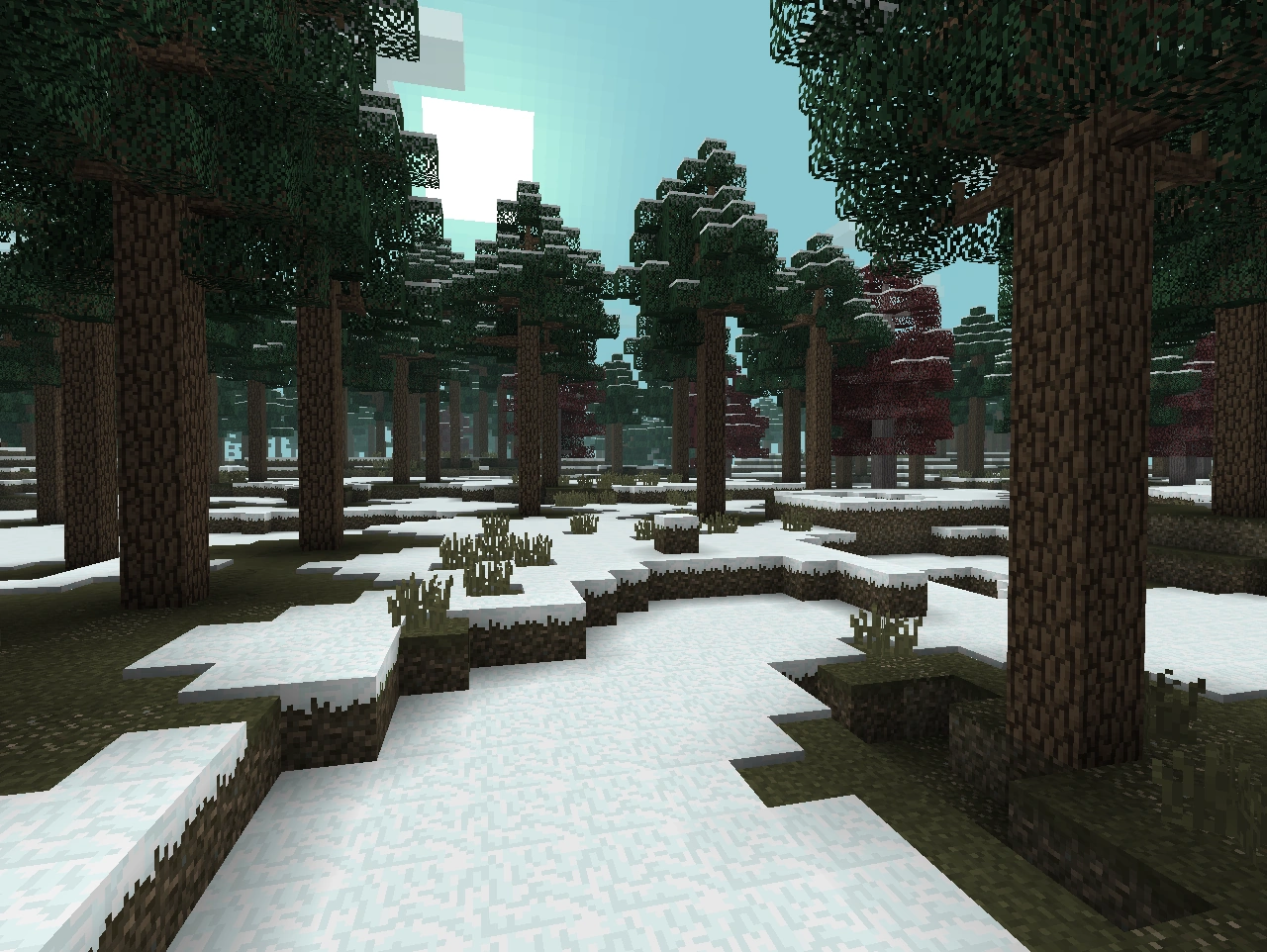 | Зона холодного климата | Основные биомы: Тайга, Холмистая тайга, Снежная равнина. Дополнительные биомы: Замёрзшая низина. Граница зоны чаще всего представлена снежной равниной, однако данный биом может занимать и обширные территории. Деревья: Туманная сосна, Снежное дерево, Каменное дерево. Снежное дерево можно встретить только в холмистой тайге. Каменное дерево встречается очень редко в виде небольших групп деревьев. В данной зоне можно найти только каменистую почву. Очень часто встречаются залежи гравия, на равнинах, порой выходящие на поверхность. Так же можно найти серую глину. | |