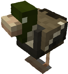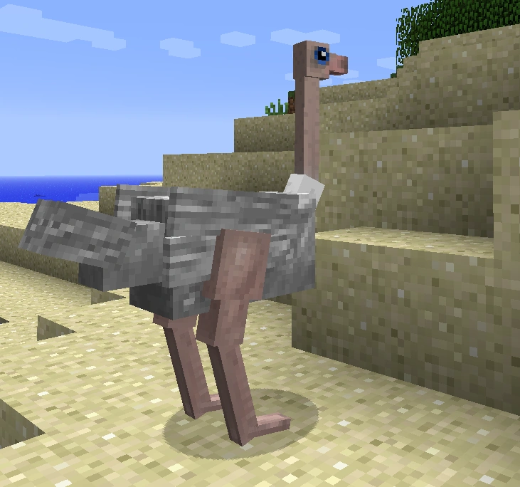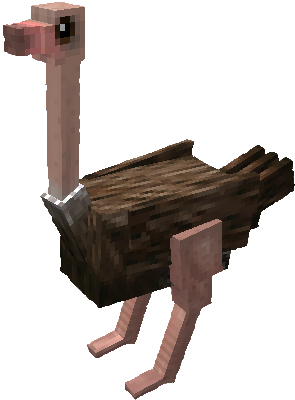 Спаунится на равнинах и в пустынях группами по 2-5 особей. Бывают особи мужского и женского пола, а также их детеныши. Самец будет вас атаковать, если вы нанесете ему урон. Самцы чёрного цвета, самки коричневого. Также существуют редкие страусы-альбиносы (белого цвета). Обычно они спаунятся по одной особи. Все детеныши коричневого цвета. Также в пустыне можно обнаружить страусиные яйца. Если их взять, то страус-самка и страус-самец нападут на вас. Из яйца может вылупиться детеныш страуса. Нужно положить яйцо рядом с факелом, отойти и подождать. Вскоре появится птенец. Кормить его можно хлебом и пшеницей. Страусёнок будет приручен и будет следовать за вами повсюду. Вы можете дать вашим прирученным страусам имя. Это имя может быть изменено путем взаимодействия со страусом, держа медальон или книги. После того, как страус становится взрослым, он поменяет свои перья. Вы можете настроить (заставить его стоять или двигаться) вашего прирученного страуса с помощью кнута.