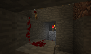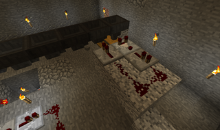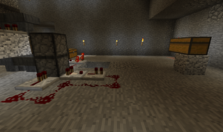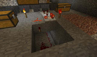8. С другой стороны, на следующей по ходу воронке устанавливаем компаратор, к нему боком еще один компаратор, переключив его в режим вычитания, за компаратором красный факел, перед компаратором блок красного провода. Впереди копаем яму 2х2 с туннелем под эту же воронку. Устанавливаем красный факел на блоке с красным проводом от компаратора и от факела ведем сигнал в тоннель.