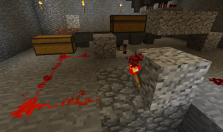 7. Над красным факелом устанавливаем блок, на него устанавливаем еще один красный факел и протягиваем мост из блоков к предпоследней воронке подачи вещей в сортировочный сундук, затем прокладываем по мосту красный провод. Это обеспечит обратную связь с подачей вещей, немного замедлив поток, что позволит сортировать без ошибок.